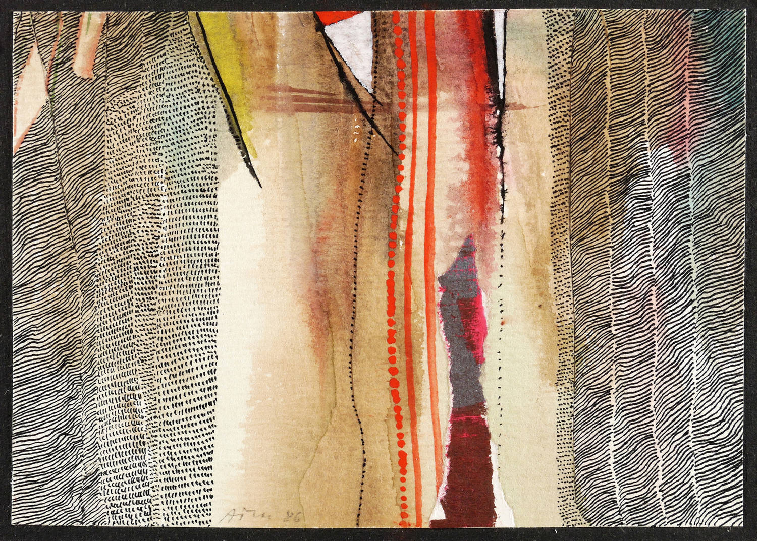 1986. Mischtechnik / Aquarell, Tusche & Papiercollage, auf hellgelbem Aquarellkarton. – Originale Künstlergrafik, von Alfred Traugott Mörstedt. – Unikat. – 10,5 x 14,7 cm (Darstellung / Blatt), 11,3 x 15,4 cm (Trägerkarton).