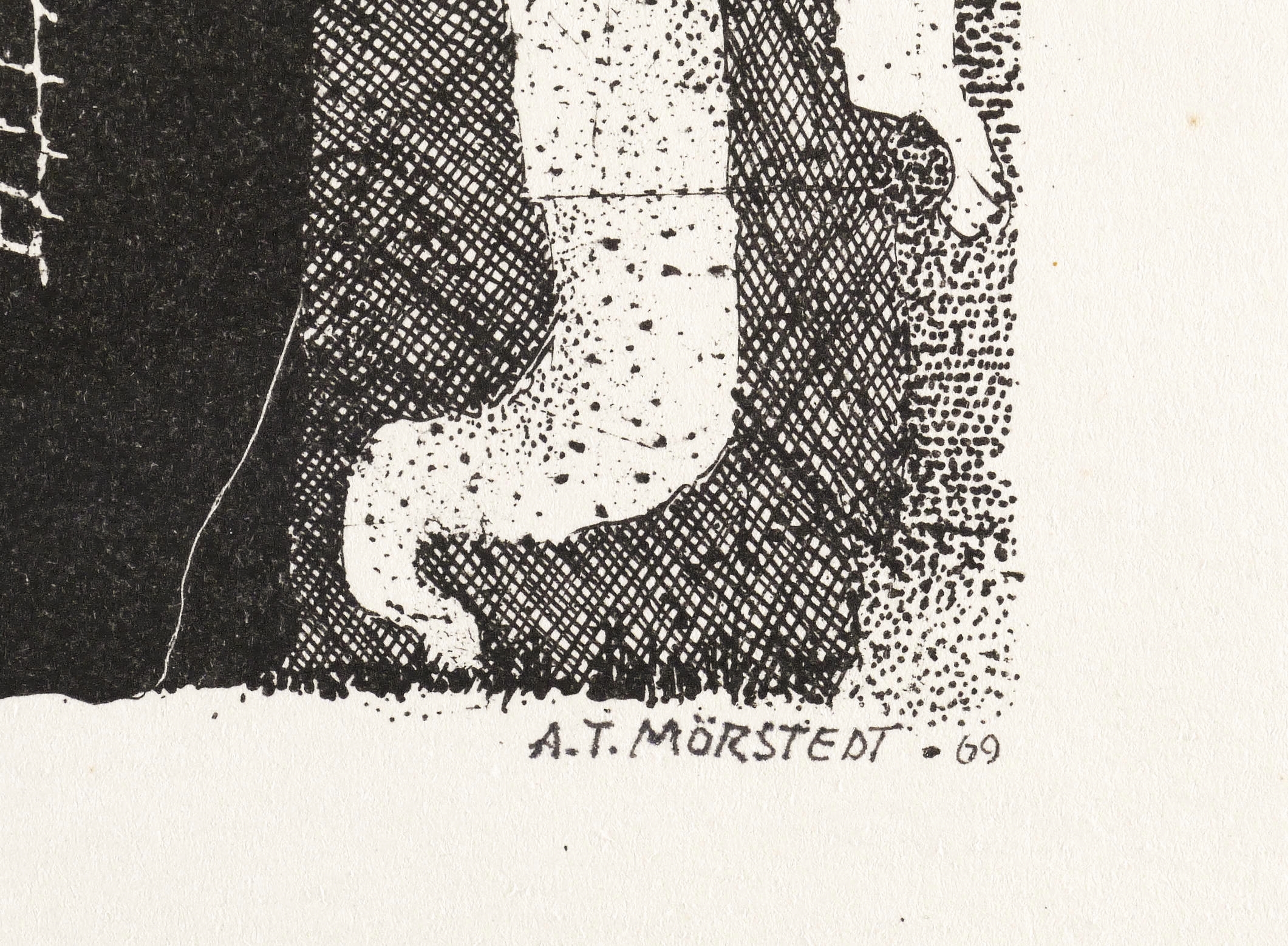 1969. Lithografie / Feder- & Pinsellithografie, partiell punktiert, in Schwarz, auf hartem chamois Velin. – Originale Künstlergrafik, von Alfred Traugott Mörstedt. – Auflage Exemplar Nr. 24/50. – 17,3 x 14,5 cm (Darstellung / Druckbild), 20 x 19 cm (Blatt).