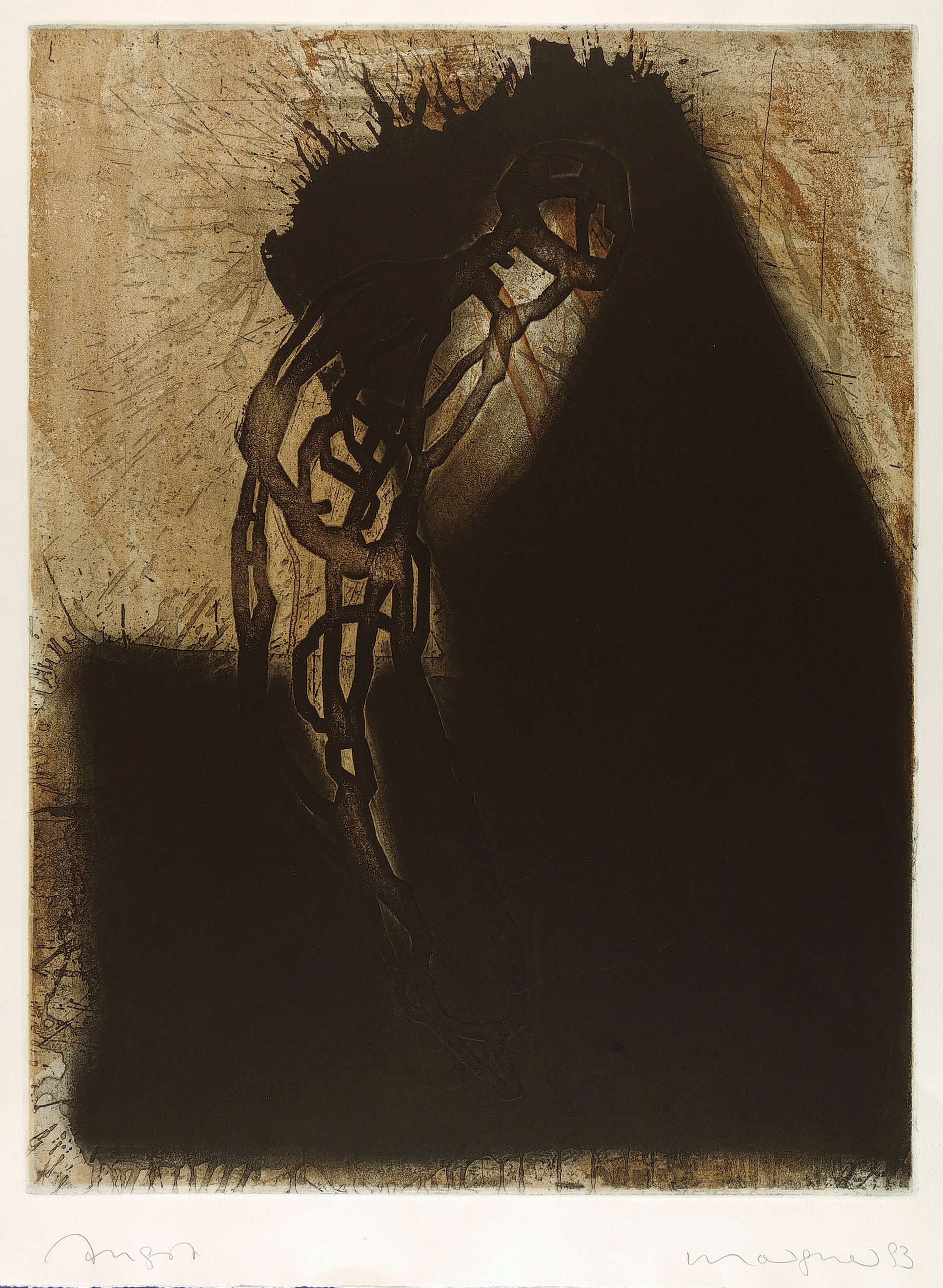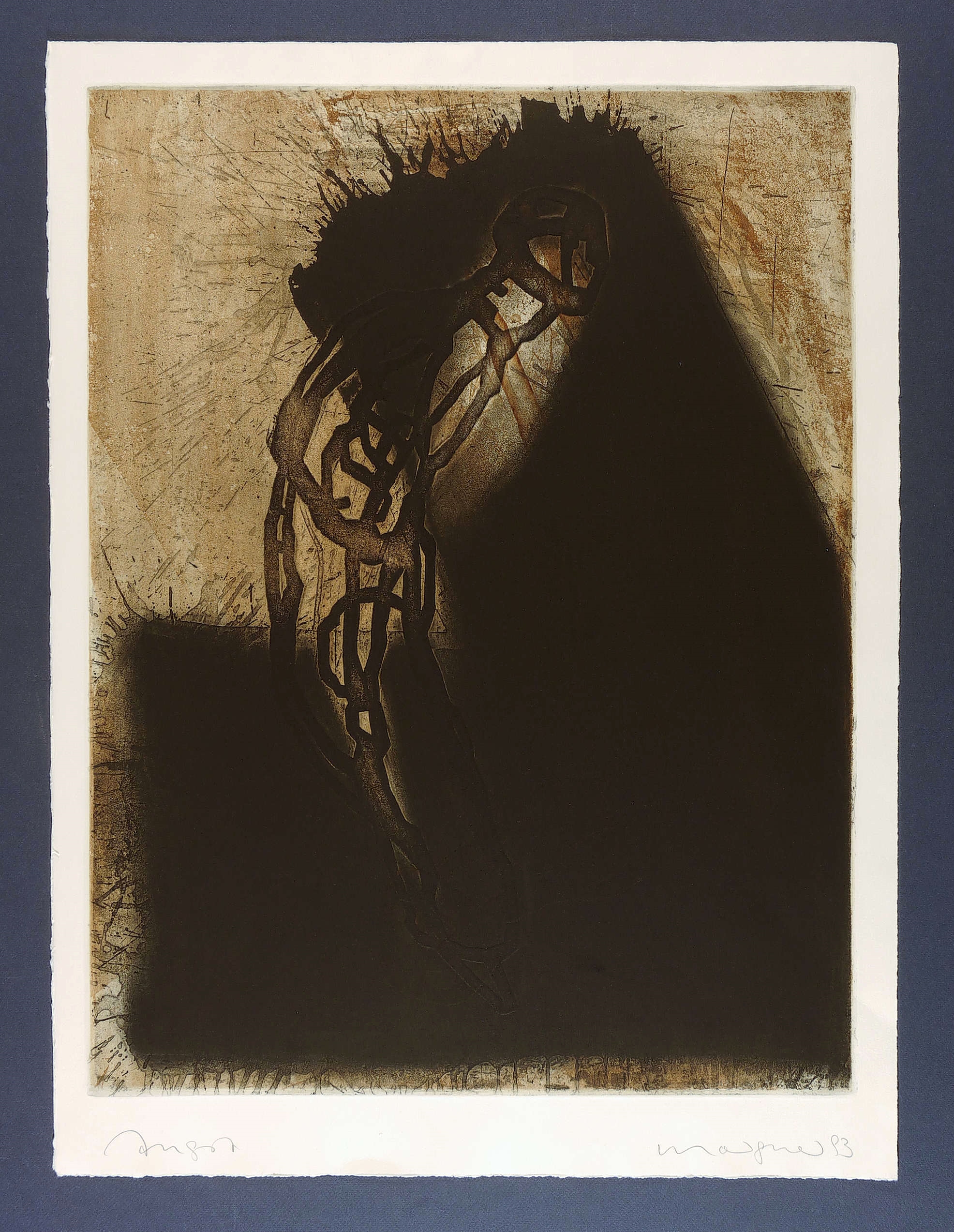 1993. Farbradierung / Aquatinta, in Schwarz und Braun, auf Hahnemühle-Bütten. – Originale Künstlergrafik, von Michael Morgner. – 64,3 x 48,6 cm (Darstellung / Platte), 72 x 54 cm (Blatt).