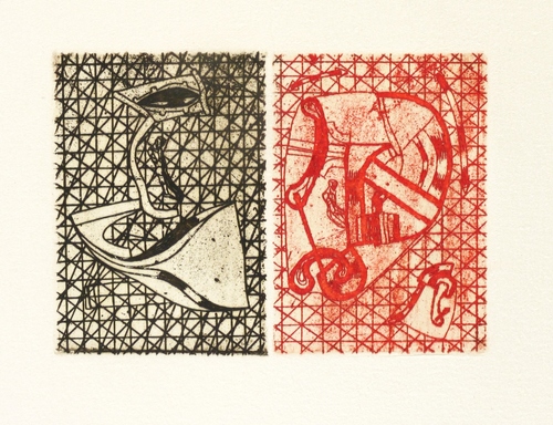 2007. Farbradierung / Strichätzung, in Rot & Schwarz, auf schwerem hellchamois Hahnemühle. – Originale Künstlergrafik, von Michael Morgner. – 7,1 x 10,0 cm (Darstellung / Druckbild), 31 x 22 cm (Blatt).