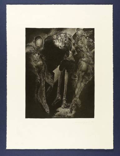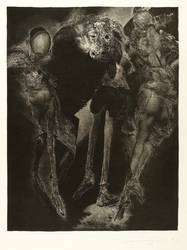 Rolf Münzner (1942 Geringswolde, lebt und arbeitet in Geithain bei Leipzig). Deutscher Zeichner und Grafiker. 1956-60 Lehre und Arbeit als Maschinenschlosser in Leisnig. 1960-62 besucht er Abendkurse an der Hochschule für Grafik und Buchkunst in Leipzig (HGB). 1962-67 Studium der Grafik und Illustration an der HGB u.a. bei Werner Tübke. 1969-72 Aspirantur. 1973-92 Lehrauftrag für Aktzeichnen und Illustration an der HGB. Seit 1990 Leiter der Werkstatt für Lithografie. Seit 1992 Professor. Seine skurrilen Figuren und bewegungsreichen Phantasiewelten werden in der seltenen Technik der Asphaltschabmanier im Steindruck umgesetzt. Detailreichtum und gesteigerte Virtuosität charakterisieren sein Werk ebenso wie eine Vorliebe für literarische Themen, denen er jeweils kongeniale Schöpfungen an die Seite stellt.