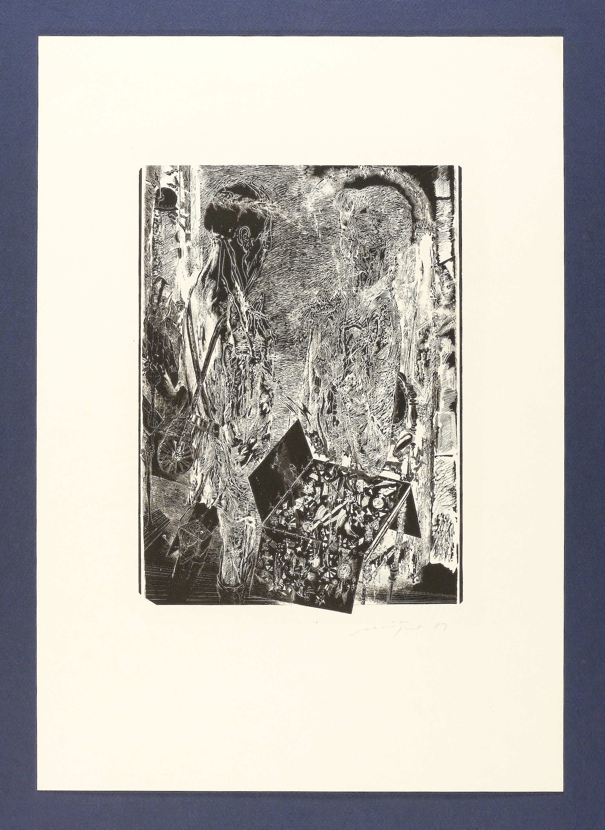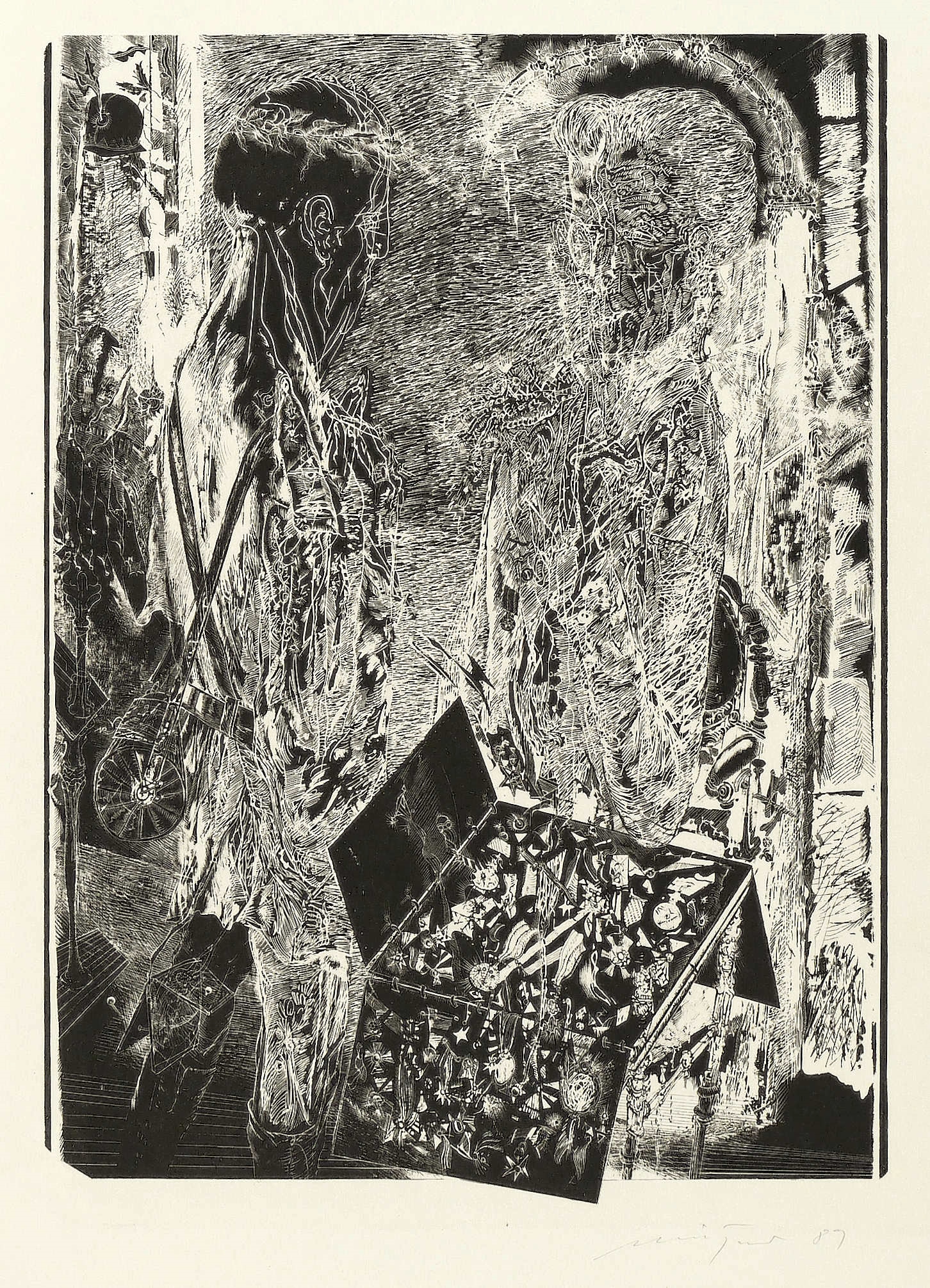 Rolf Münzner (1942 Geringswolde, lebt und arbeitet in Geithain bei Leipzig). Deutscher Zeichner und Grafiker. 1956-60 Lehre und Arbeit als Maschinenschlosser in Leisnig. 1960-62 besucht er Abendkurse an der Hochschule für Grafik und Buchkunst in Leipzig (HGB). 1962-67 Studium der Grafik und Illustration an der HGB u.a. bei Werner Tübke. 1969-72 Aspirantur. 1973-92 Lehrauftrag für Aktzeichnen und Illustration an der HGB. Seit 1990 Leiter der Werkstatt für Lithografie. Seit 1992 Professor. Seine skurrilen Figuren und bewegungsreichen Phantasiewelten werden in der seltenen Technik der Asphaltschabmanier im Steindruck umgesetzt. Detailreichtum und gesteigerte Virtuosität charakterisieren sein Werk ebenso wie eine Vorliebe für literarische Themen, denen er jeweils kongeniale Schöpfungen an die Seite stellt.