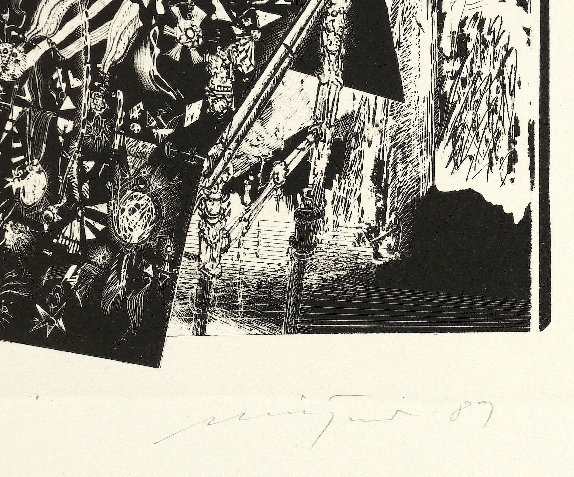 1989. Lithografie / Schablithografie, in Schwarz, auf hellgelbem Karton. – Von Rolf Münzner. – Druckerexemplar. – 29,4 x 21,3 cm (Darstellung), 50 x 35 cm (Blatt).