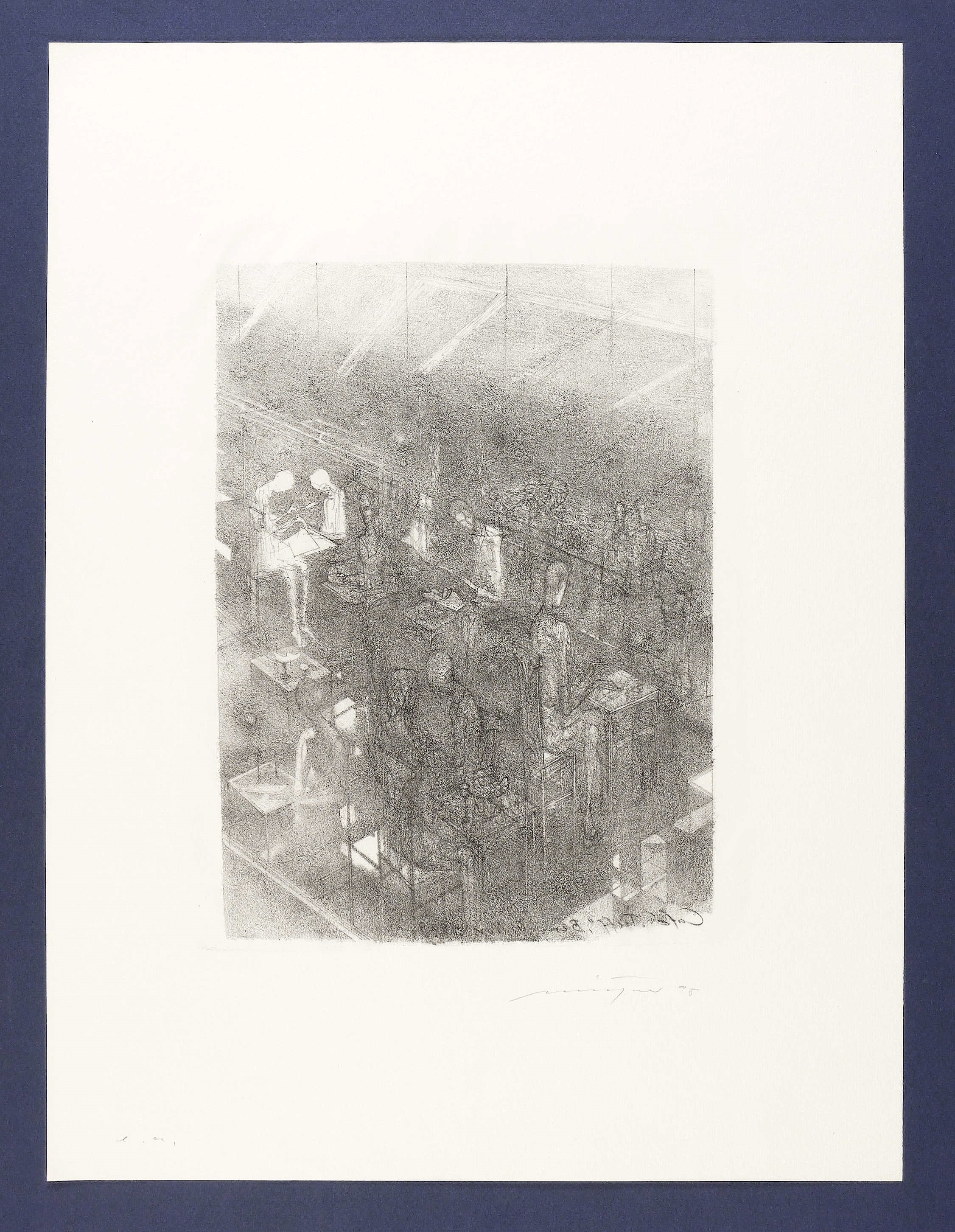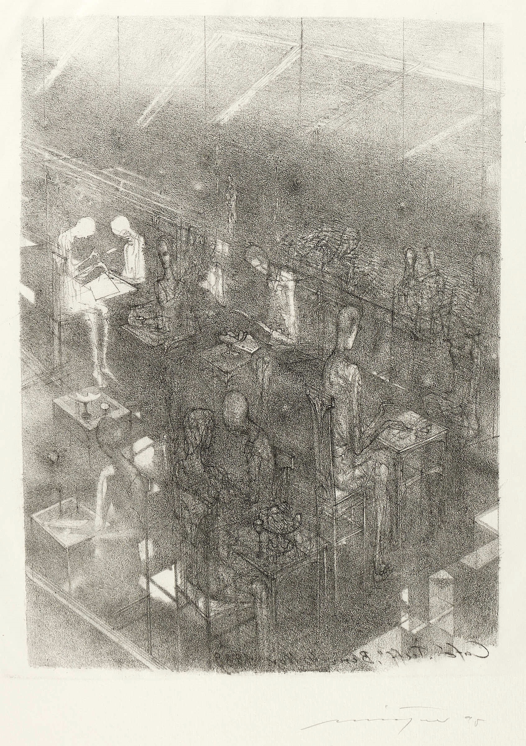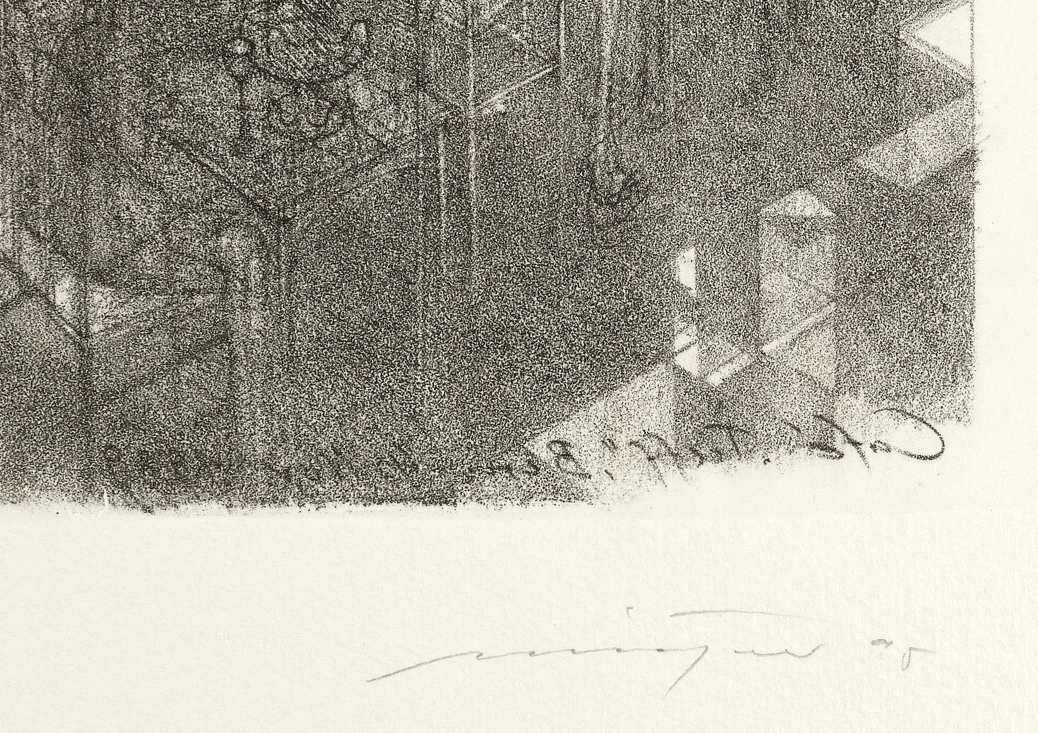 1990. Lithografie / Schablithografie, in Schwarz, auf Kupferdruckpapier. – Originale Künstlergrafik, von Rolf Münzner. – Künstlerexemplar (e.a.). – 29,9 x 21,5 cm (Darstellung), 32 x 25 cm (Stein), 50 x 37,5 cm (Blatt).