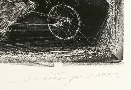 1992. Lithografie / Schablithografie, in Schwarz, auf schwerem Büttenkarton. – Von Rolf Münzner. – Künstlerexemplar (e.a.). – 33,5 x 49,5 cm (Darstellung / Druckbild), 36,5 x 51 cm (Stein), 51,5 x 69 cm (Blatt).