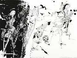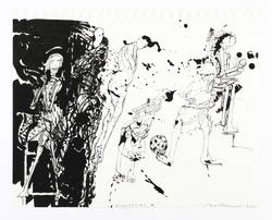 Rolf Münzner (1942 Geringswolde, lebt und arbeitet in Geithain bei Leipzig). Deutscher Zeichner und Grafiker. 1956-60 Lehre und Arbeit als Maschinenschlosser in Leisnig. 1960-62 besucht er Abendkurse an der Hochschule für Grafik und Buchkunst in Leipzig (HGB). 1962-67 Studium der Grafik und Illustration an der HGB u.a. bei Werner Tübke. 1969-72 Aspirantur. 1973-92 Lehrauftrag für Aktzeichnen und Illustration an der HGB. Seit 1990 Leiter der Werkstatt für Lithografie. Seit 1992 Professor. Seine skurrilen Figuren und bewegungsreichen Phantasiewelten werden in der seltenen Technik der Asphaltschabmanier im Steindruck umgesetzt. Detailreichtum und gesteigerte Virtuosität charakterisieren sein Werk ebenso wie eine Vorliebe für literarische Themen, denen er jeweils kongeniale Schöpfungen an die Seite stellt.
