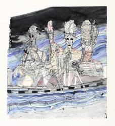 2002. Zeichnung / Feder- & Pinselzeichnung, in schwarzer, blauer, grüner & roter Tusche, auf Maschinenbütten. – Originale Künstlergrafik, von Rolf Münzner. – Unikat. – 33,5 x 30,2 cm (Darstellung / Blatt), 69 x 50 cm (Trägerblatt).