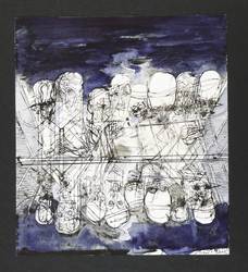 Rechts unten in Tusche signiert und datiert. Auf dem Trägerblatt unten mittig betitelt ″Die letzte Sitzung″. Rechts dazu datiert. – Vom Künstler original auf Trägerblatt gesetzt und in Passepartout montiert. Sehr guter Zustand.