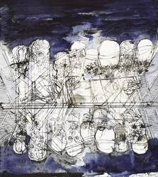 2002. Zeichnung / Feder- & Pinselzeichnung, in schwarzer & blauer Tusche, auf Maschinenbütten. – Originale Künstlergrafik, von Rolf Münzner. – Unikat. – 34,0 x 30,0 cm (Darstellung / Blatt), 65 x 50 cm (Trägerblatt).