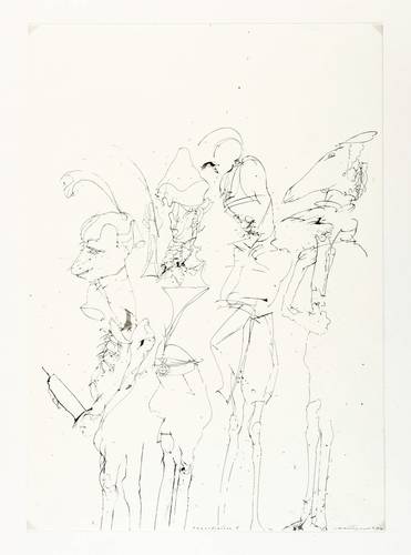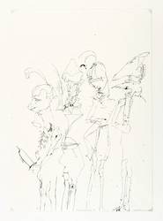 Rolf Münzner (1942 Geringswolde, lebt und arbeitet in Geithain bei Leipzig). Deutscher Zeichner und Grafiker. 1956-60 Lehre und Arbeit als Maschinenschlosser in Leisnig. 1960-62 besucht er Abendkurse an der Hochschule für Grafik und Buchkunst in Leipzig (HGB). 1962-67 Studium der Grafik und Illustration an der HGB u.a. bei Werner Tübke. 1969-72 Aspirantur. 1973-92 Lehrauftrag für Aktzeichnen und Illustration an der HGB. Seit 1990 Leiter der Werkstatt für Lithografie. Seit 1992 Professor. Seine skurrilen Figuren und bewegungsreichen Phantasiewelten werden in der seltenen Technik der Asphaltschabmanier im Steindruck umgesetzt. Detailreichtum und gesteigerte Virtuosität charakterisieren sein Werk ebenso wie eine Vorliebe für literarische Themen, denen er jeweils kongeniale Schöpfungen an die Seite stellt.