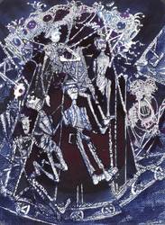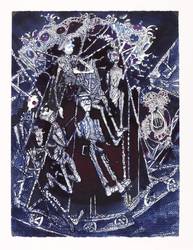 Rolf Münzner (1942 Geringswolde, lebt und arbeitet in Geithain bei Leipzig). Deutscher Zeichner und Grafiker. 1956-60 Lehre und Arbeit als Maschinenschlosser in Leisnig. 1960-62 besucht er Abendkurse an der Hochschule für Grafik und Buchkunst in Leipzig (HGB). 1962-67 Studium der Grafik und Illustration an der HGB u.a. bei Werner Tübke. 1969-72 Aspirantur. 1973-92 Lehrauftrag für Aktzeichnen und Illustration an der HGB. Seit 1990 Leiter der Werkstatt für Lithografie. Seit 1992 Professor. Seine skurrilen Figuren und bewegungsreichen Phantasiewelten werden in der seltenen Technik der Asphaltschabmanier im Steindruck umgesetzt. Detailreichtum und gesteigerte Virtuosität charakterisieren sein Werk ebenso wie eine Vorliebe für literarische Themen, denen er jeweils kongeniale Schöpfungen an die Seite stellt.
