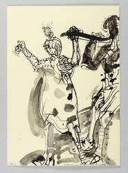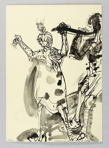 Links unten in Tusche signiert und datiert. Mittig dazu betitelt. Verso in Tusche bezeichnet ″Harnisch / Figuren zu J. v. Saaz″. – Vom Künstler original auf Trägerkarton gesetzt und in Passepartout montiert. Sehr guter Zustand.