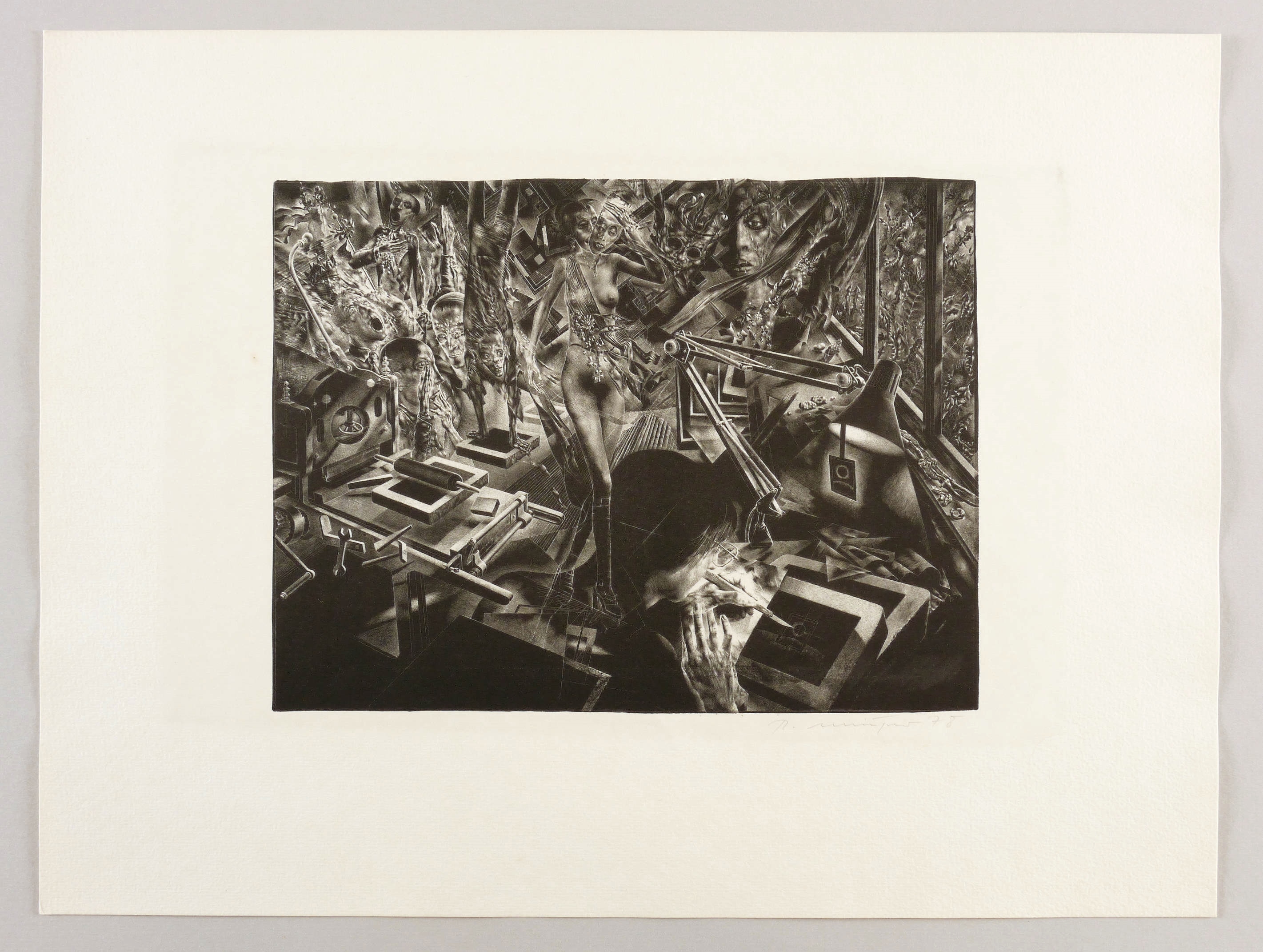 Rolf Münzner (1942 Geringswolde, lebt und arbeitet in Geithain bei Leipzig). Deutscher Zeichner und Grafiker. 1956-60 Lehre und Arbeit als Maschinenschlosser in Leisnig. 1960-62 besucht er Abendkurse an der Hochschule für Grafik und Buchkunst in Leipzig (HGB). 1962-67 Studium der Grafik und Illustration an der HGB u.a. bei Werner Tübke. 1969-72 Aspirantur. 1973-92 Lehrauftrag für Aktzeichnen und Illustration an der HGB. Seit 1990 Leiter der Werkstatt für Lithografie. Seit 1992 Professor. Seine skurrilen Figuren und bewegungsreichen Phantasiewelten werden in der seltenen Technik der Asphaltschabmanier im Steindruck umgesetzt. Detailreichtum und gesteigerte Virtuosität charakterisieren sein Werk ebenso wie eine Vorliebe für literarische Themen, denen er jeweils kongeniale Schöpfungen an die Seite stellt.