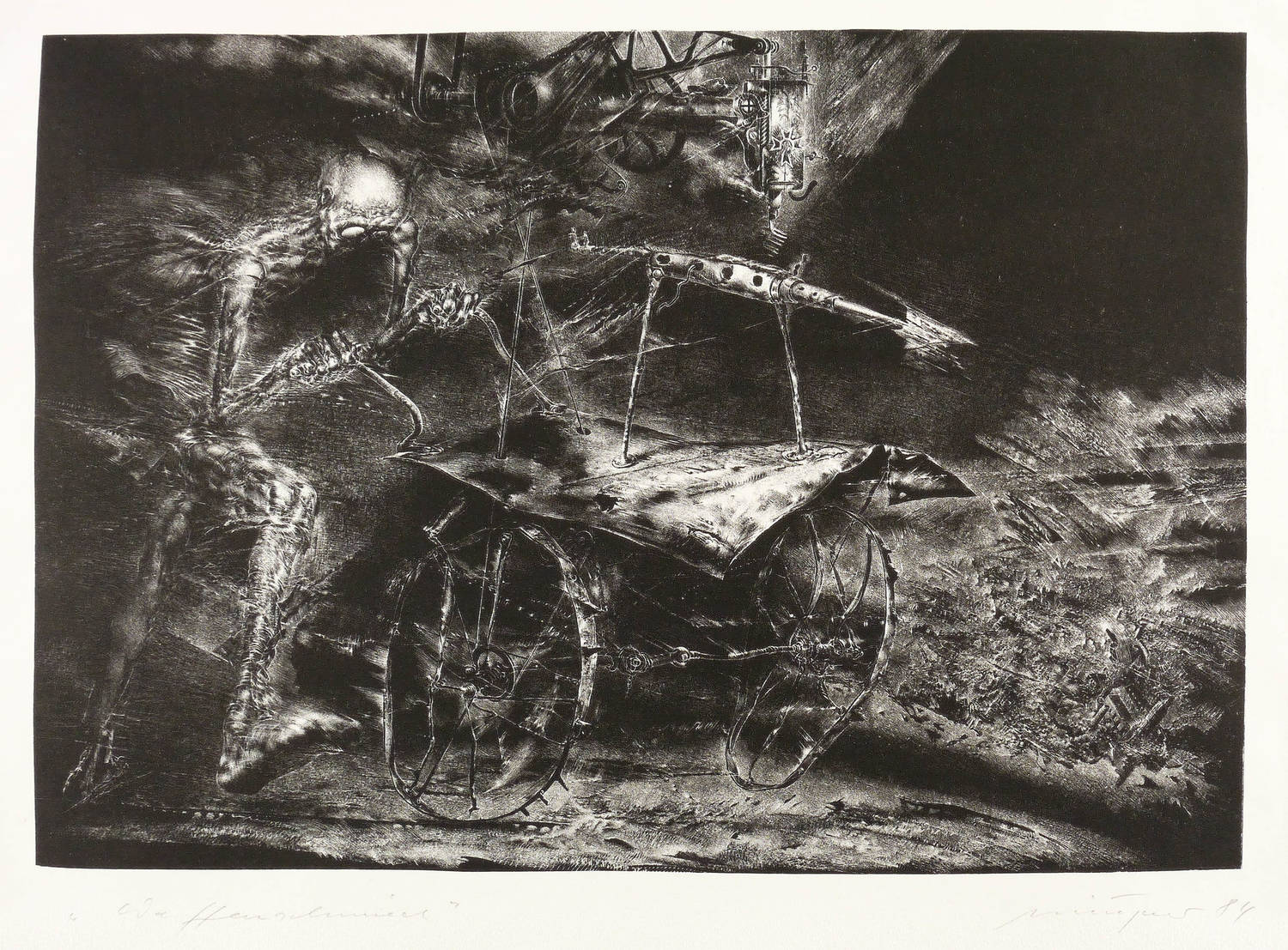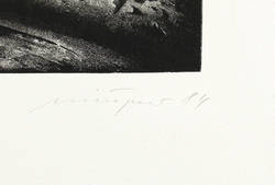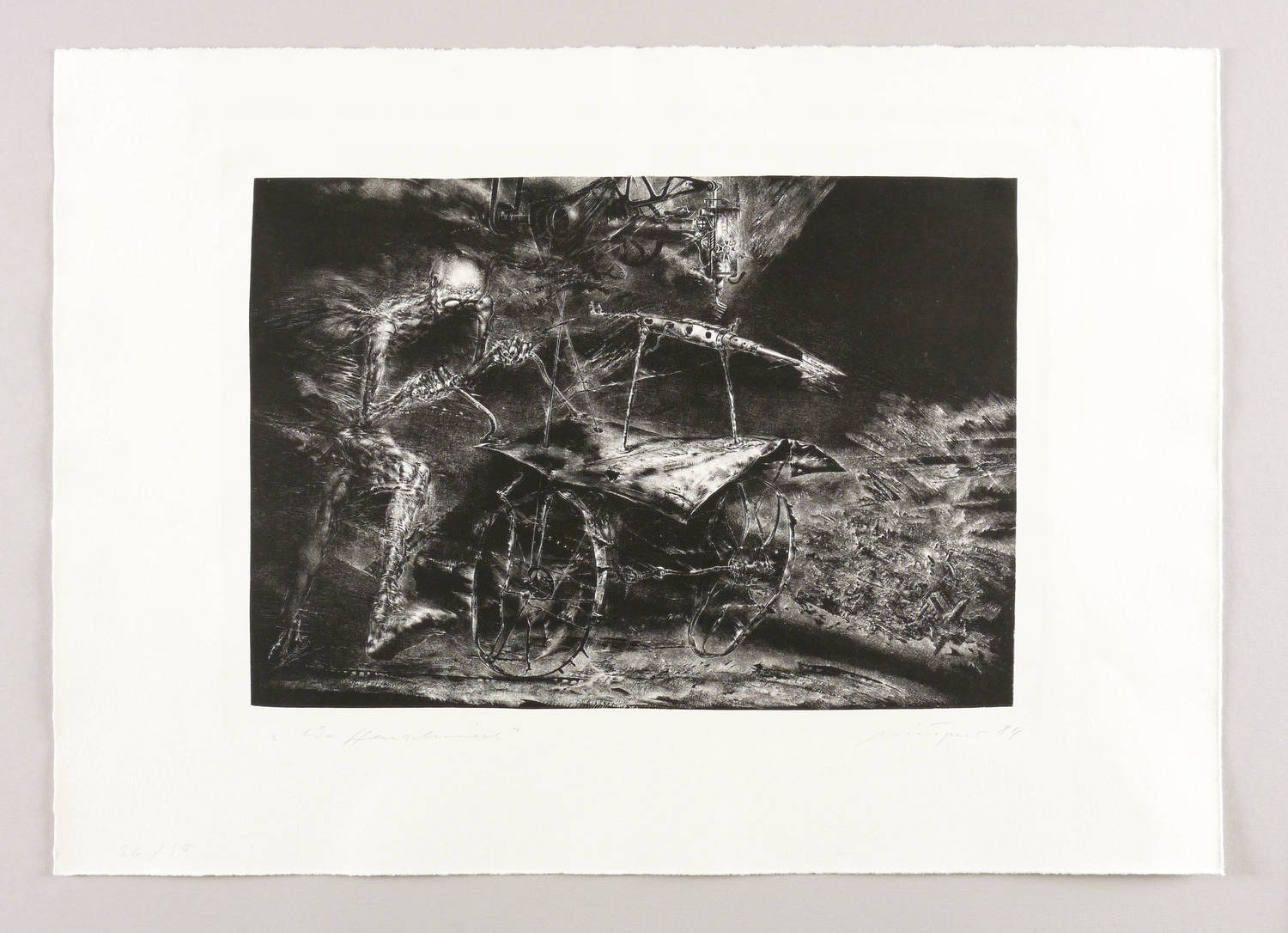 1984. Lithografie / Schablithografie, in Schwarz, auf chamois Büttenkarton. – Von Rolf Münzner. – Auflage Exemplar Nr. 26/50. – 25,7 x 36,8 cm (Darstellung / Druckbild), 40 x 56 cm (Blatt).