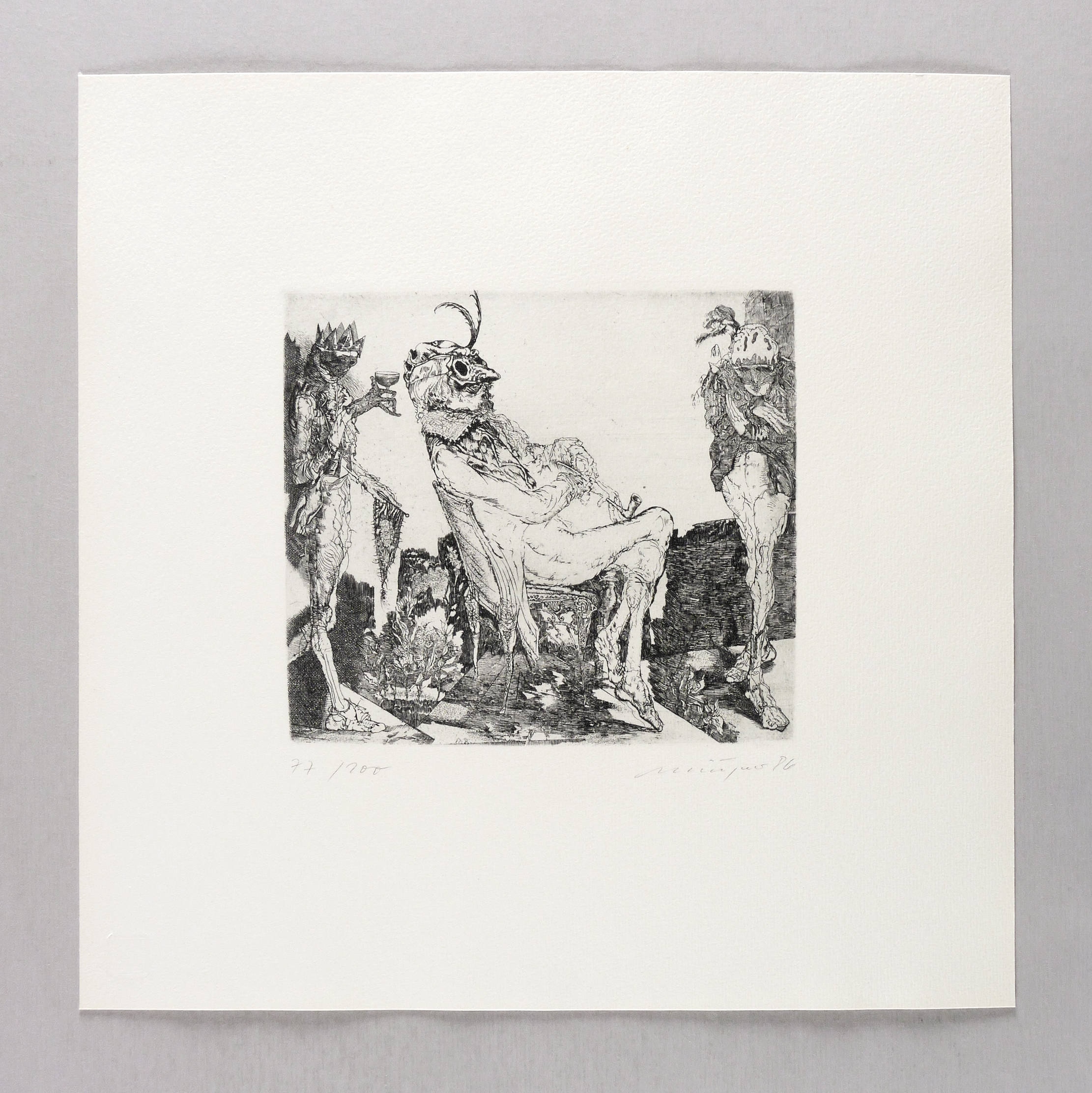 Rolf Münzner (1942 Geringswolde, lebt und arbeitet in Geithain bei Leipzig). Deutscher Zeichner und Grafiker. 1956-60 Lehre und Arbeit als Maschinenschlosser in Leisnig. 1960-62 besucht er Abendkurse an der Hochschule für Grafik und Buchkunst in Leipzig (HGB). 1962-67 Studium der Grafik und Illustration an der HGB u.a. bei Werner Tübke. 1969-72 Aspirantur. 1973-92 Lehrauftrag für Aktzeichnen und Illustration an der HGB. Seit 1990 Leiter der Werkstatt für Lithografie. Seit 1992 Professor. Seine skurrilen Figuren und bewegungsreichen Phantasiewelten werden in der seltenen Technik der Asphaltschabmanier im Steindruck umgesetzt. Detailreichtum und gesteigerte Virtuosität charakterisieren sein Werk ebenso wie eine Vorliebe für literarische Themen, denen er jeweils kongeniale Schöpfungen an die Seite stellt.