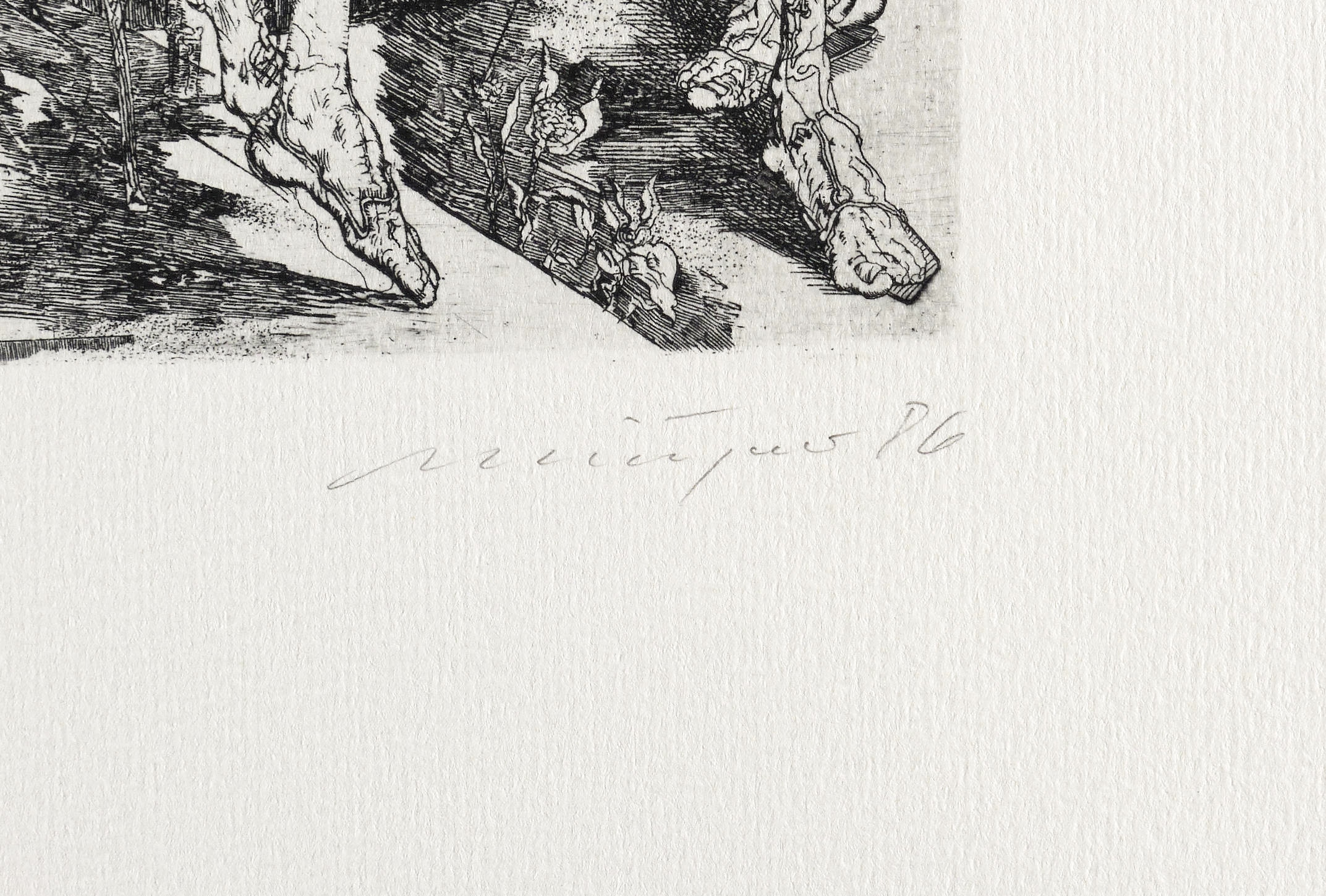 1986. Radierung / Strichätzung, mit Plattenton, auf hellchamois Weißenborn. – Originale Künstlergrafik, von Rolf Münzner. – Auflage Exemplar Nr. 77/200. – 17,4 x 19,5 cm (Darstellung / Platte), 36 x 36 cm (Blatt).