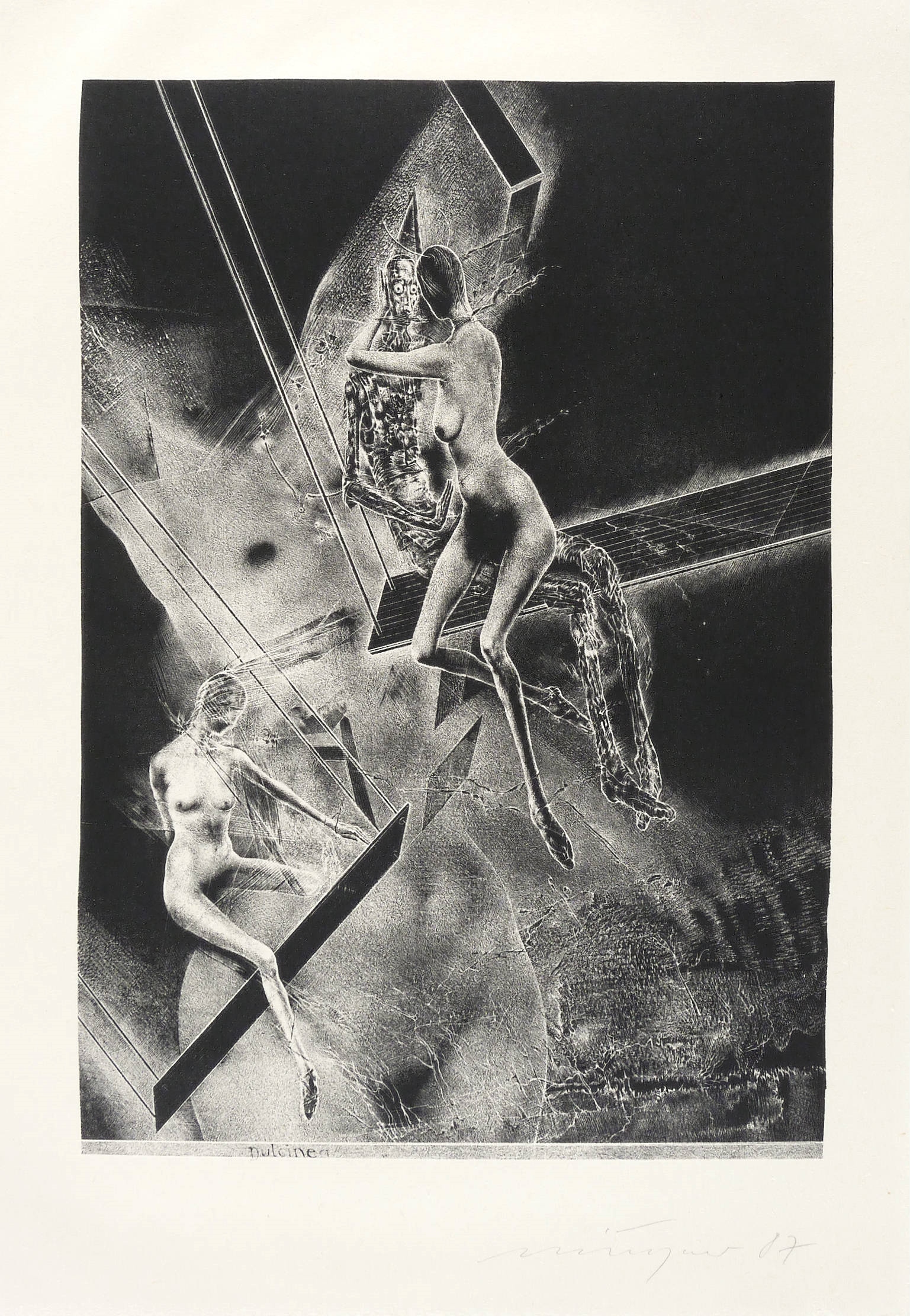 1987. Lithografie / Schablithografie, in Schwarz, auf chamois Hahnemühle. – Originale Künstlergrafik, von Rolf Münzner. – Auflage Exemplar Nr. 20/30. – 23,8 x 16,7 cm (Darstellung / Druckbild), 28,5 x 21,0 cm (Stein), 48 x 34 cm (Blatt).