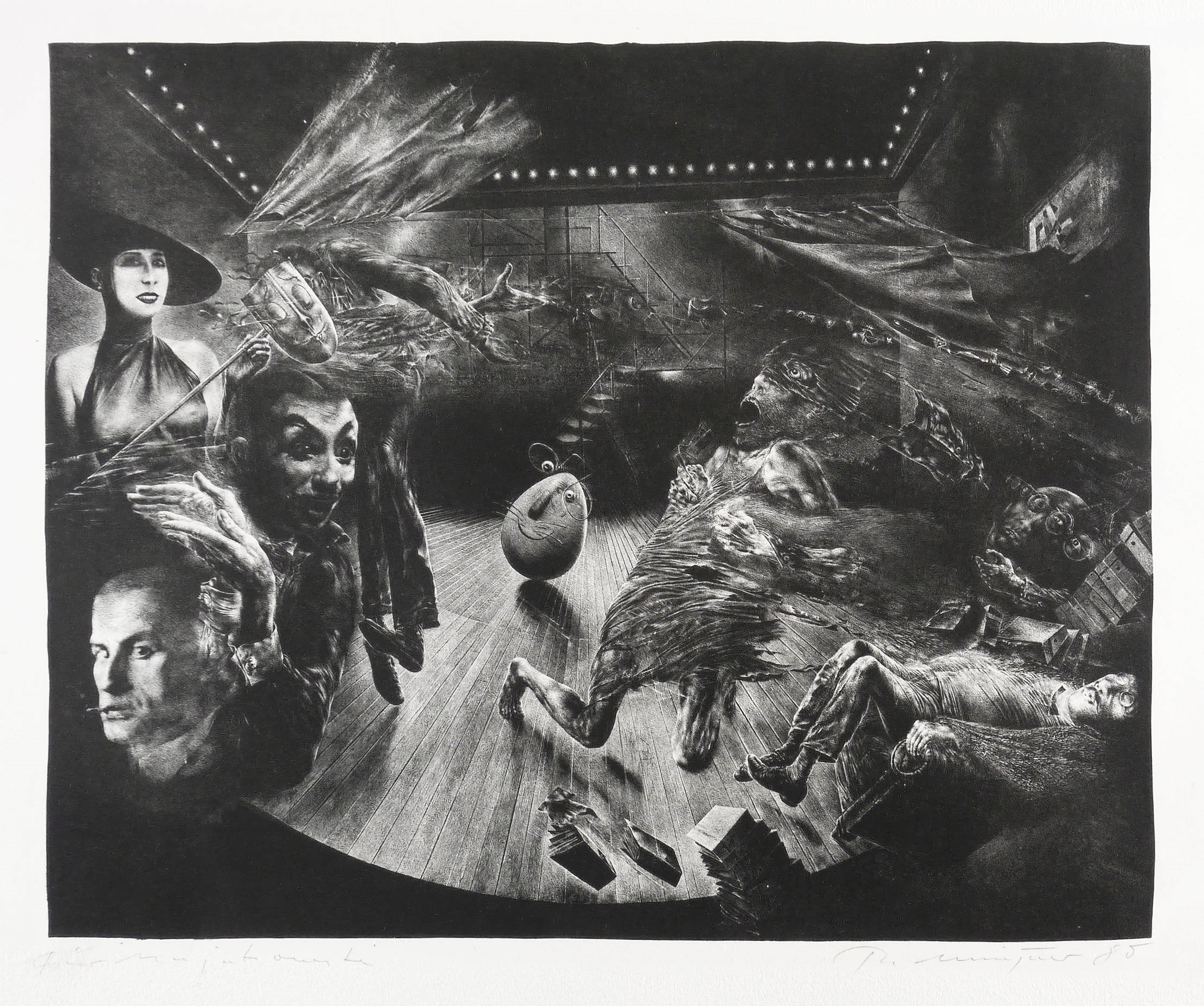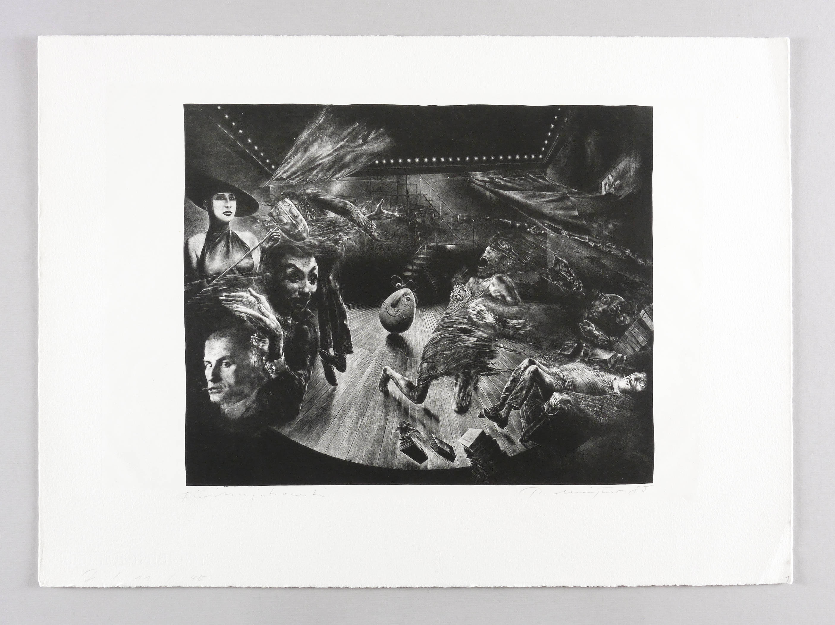 Rolf Münzner (1942 Geringswolde, lebt und arbeitet in Geithain bei Leipzig). Deutscher Zeichner und Grafiker. 1956-60 Lehre und Arbeit als Maschinenschlosser in Leisnig. 1960-62 besucht er Abendkurse an der Hochschule für Grafik und Buchkunst in Leipzig (HGB). 1962-67 Studium der Grafik und Illustration an der HGB u.a. bei Werner Tübke. 1969-72 Aspirantur. 1973-92 Lehrauftrag für Aktzeichnen und Illustration an der HGB. Seit 1990 Leiter der Werkstatt für Lithografie. Seit 1992 Professor. Seine skurrilen Figuren und bewegungsreichen Phantasiewelten werden in der seltenen Technik der Asphaltschabmanier im Steindruck umgesetzt. Detailreichtum und gesteigerte Virtuosität charakterisieren sein Werk ebenso wie eine Vorliebe für literarische Themen, denen er jeweils kongeniale Schöpfungen an die Seite stellt.