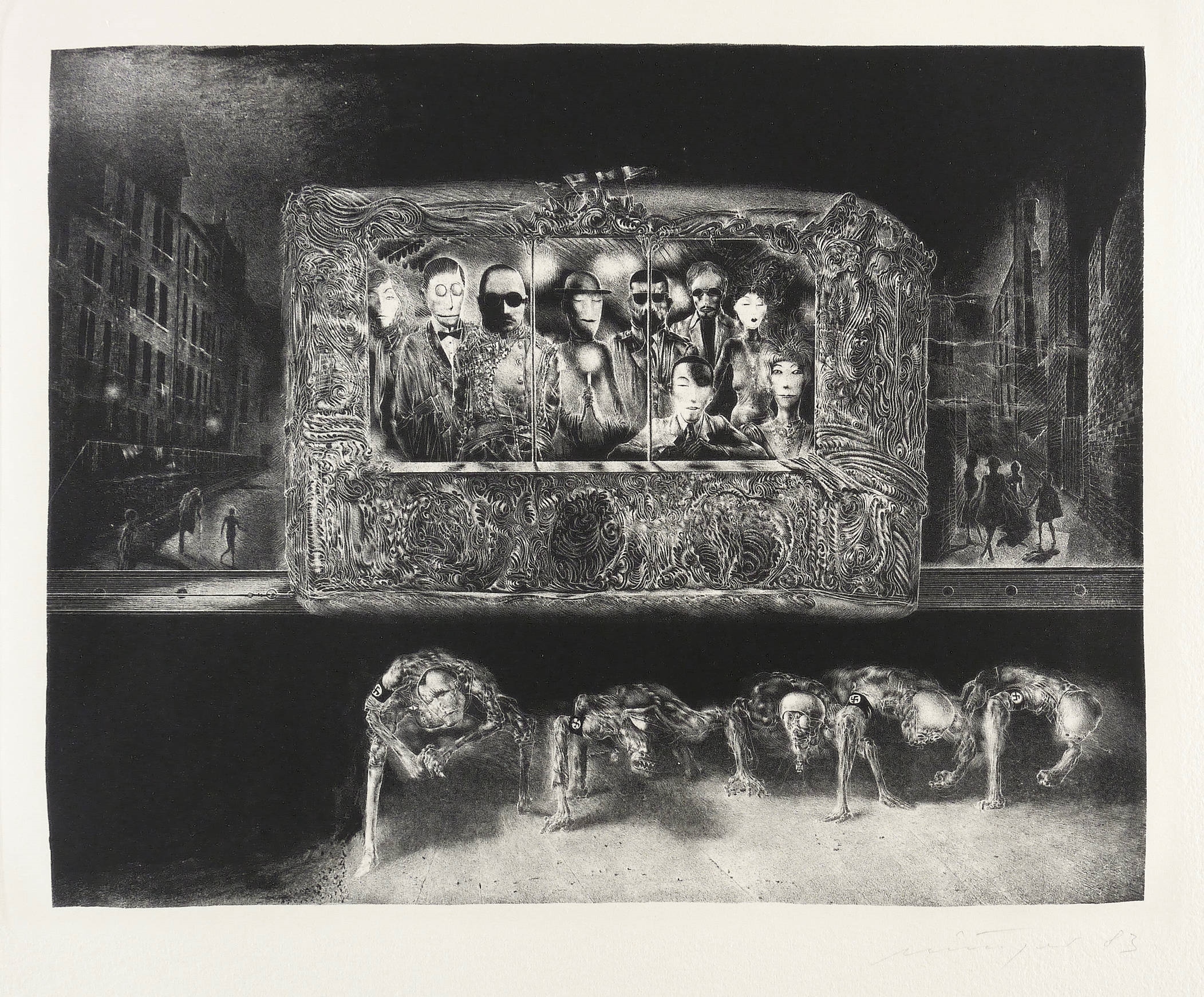 Rolf Münzner (1942 Geringswolde, lebt und arbeitet in Geithain bei Leipzig). Deutscher Zeichner und Grafiker. 1956-60 Lehre und Arbeit als Maschinenschlosser in Leisnig. 1960-62 besucht er Abendkurse an der Hochschule für Grafik und Buchkunst in Leipzig (HGB). 1962-67 Studium der Grafik und Illustration an der HGB u.a. bei Werner Tübke. 1969-72 Aspirantur. 1973-92 Lehrauftrag für Aktzeichnen und Illustration an der HGB. Seit 1990 Leiter der Werkstatt für Lithografie. Seit 1992 Professor. Seine skurrilen Figuren und bewegungsreichen Phantasiewelten werden in der seltenen Technik der Asphaltschabmanier im Steindruck umgesetzt. Detailreichtum und gesteigerte Virtuosität charakterisieren sein Werk ebenso wie eine Vorliebe für literarische Themen, denen er jeweils kongeniale Schöpfungen an die Seite stellt.