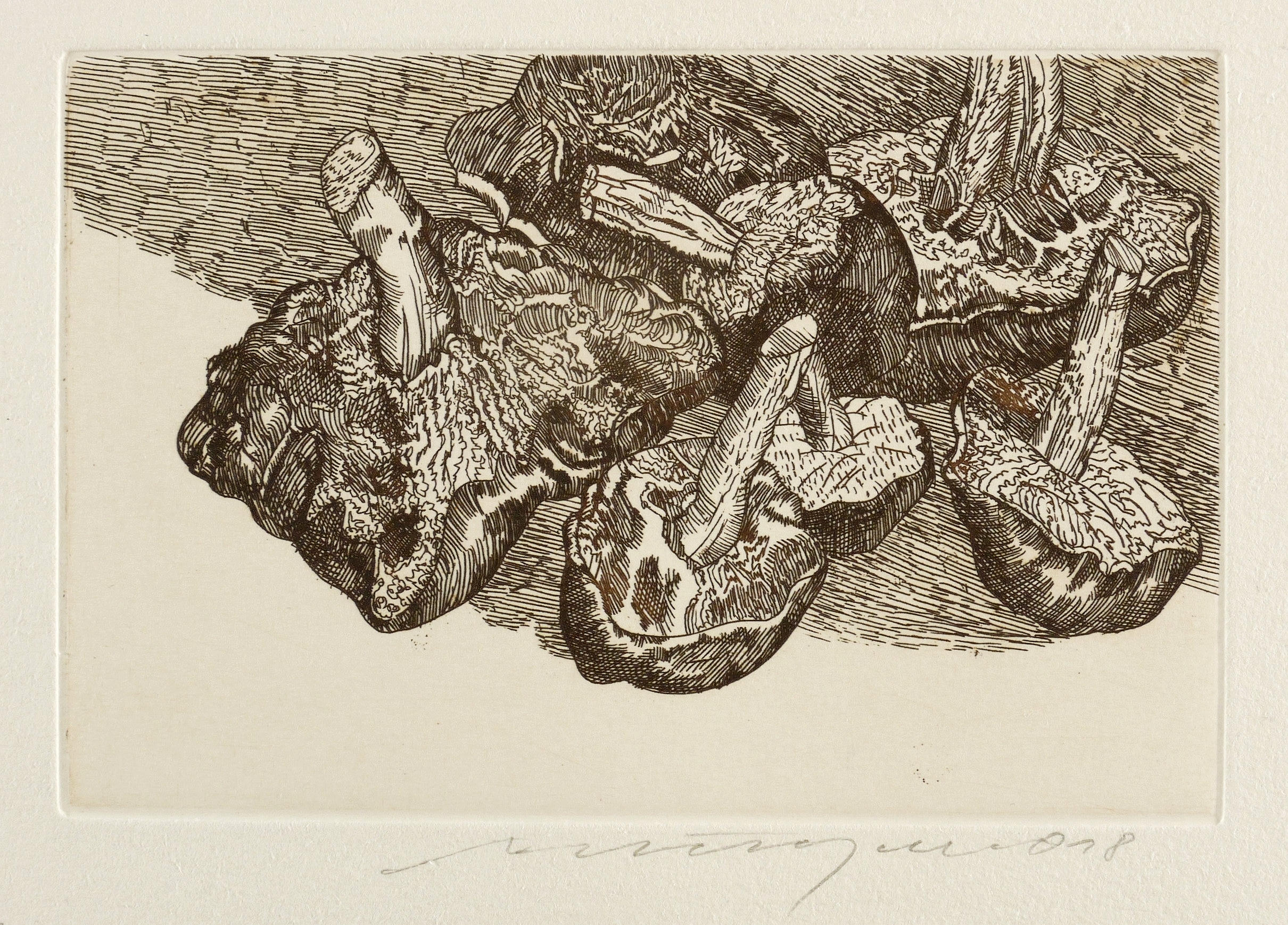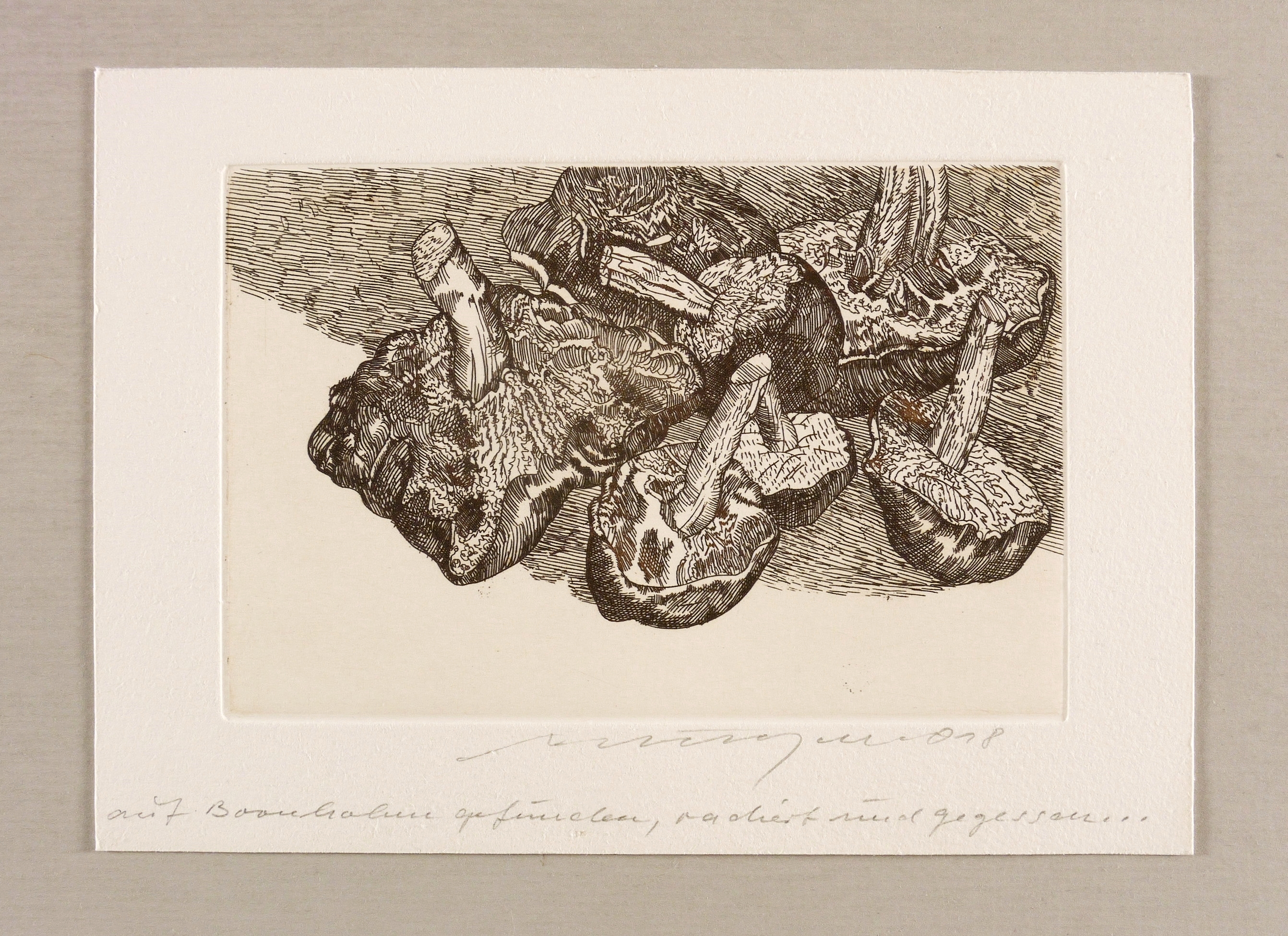 Nicht bei Lindner. – Rechts unten in Bleistift signiert und datiert: ″Münzner 018″. Im unteren Rand bezeichnet: ″auf Bornholm gefunden, radiert und gegessen″. Verso Widmung. – Sehr guter Zustand.
