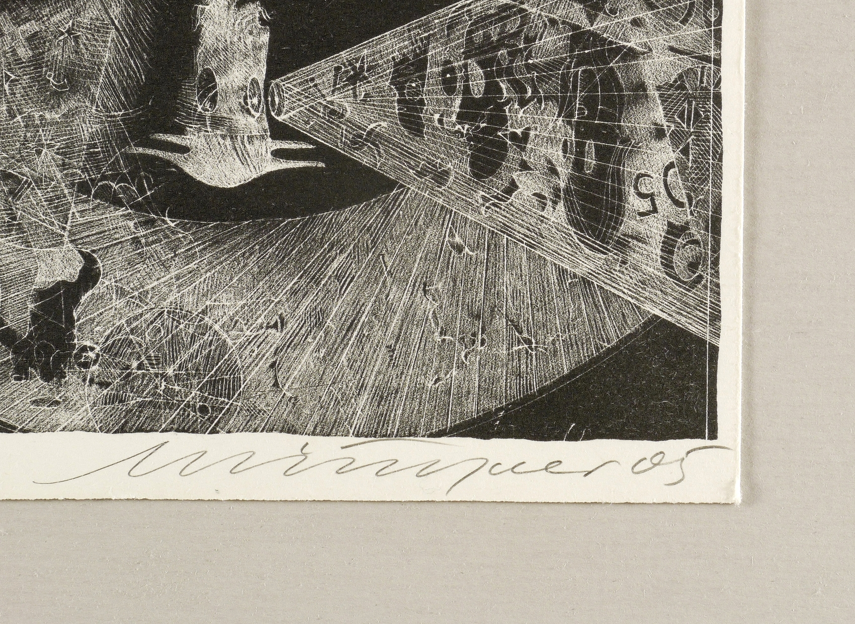 Rolf Münzner (1942 Geringswolde, lebt und arbeitet in Geithain bei Leipzig). Deutscher Zeichner und Grafiker. 1956-60 Lehre und Arbeit als Maschinenschlosser in Leisnig. 1960-62 besucht er Abendkurse an der Hochschule für Grafik und Buchkunst in Leipzig (HGB). 1962-67 Studium der Grafik und Illustration an der HGB u.a. bei Werner Tübke. 1969-72 Aspirantur. 1973-92 Lehrauftrag für Aktzeichnen und Illustration an der HGB. Seit 1990 Leiter der Werkstatt für Lithografie. Seit 1992 Professor. Seine skurrilen Figuren und bewegungsreichen Phantasiewelten werden in der seltenen Technik der Asphaltschabmanier im Steindruck umgesetzt. Detailreichtum und gesteigerte Virtuosität charakterisieren sein Werk ebenso wie eine Vorliebe für literarische Themen, denen er jeweils kongeniale Schöpfungen an die Seite stellt.
