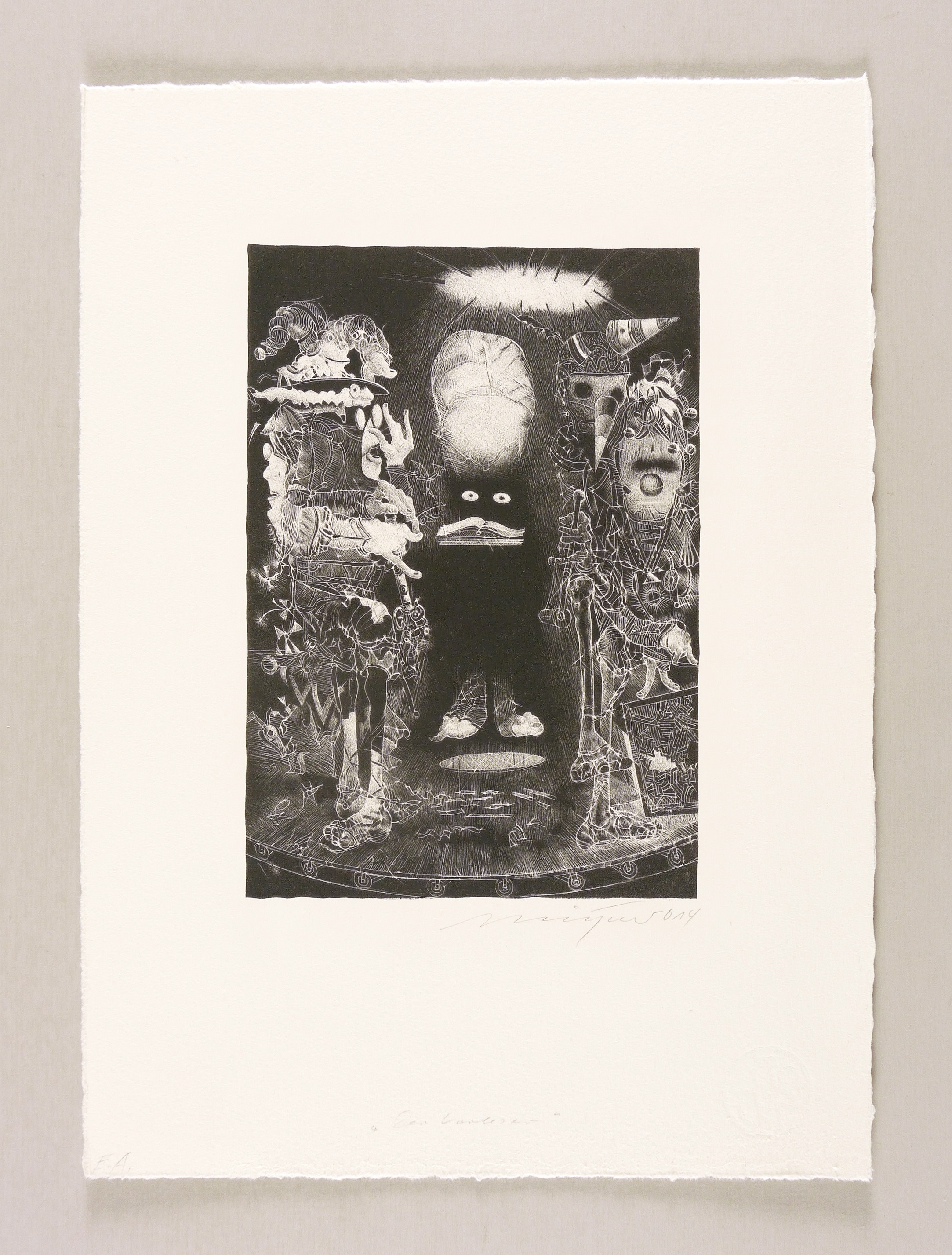2014. Lithografie / Schablithografie, in Schwarz, auf kräftigem hellchamois Hahnemühle. – Von Rolf Münzner. – Künstlerexemplar (e.a.). – 22,1 x 15,4 cm (Darstellung / Druckbild), 37 x 27 cm (Blatt).