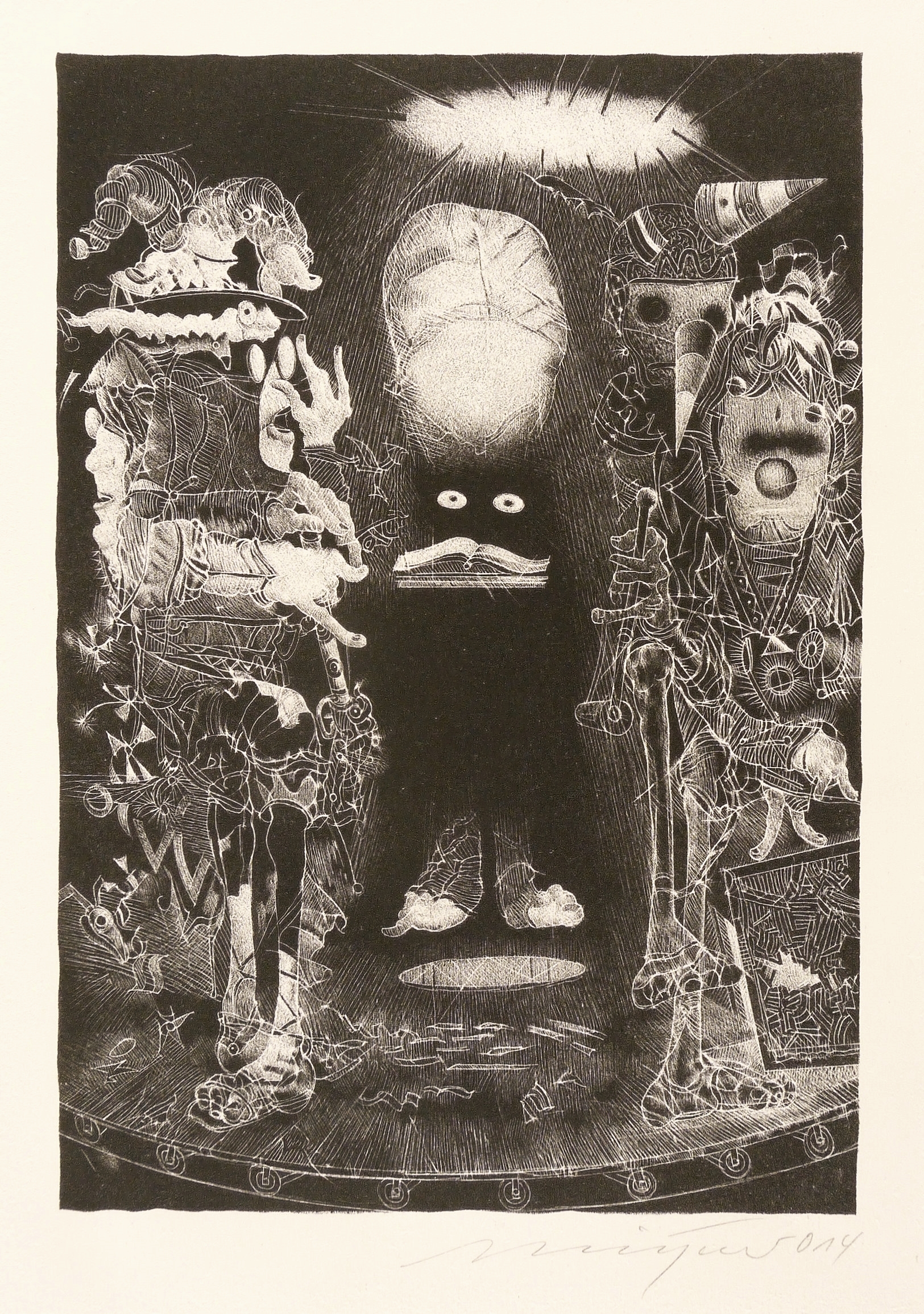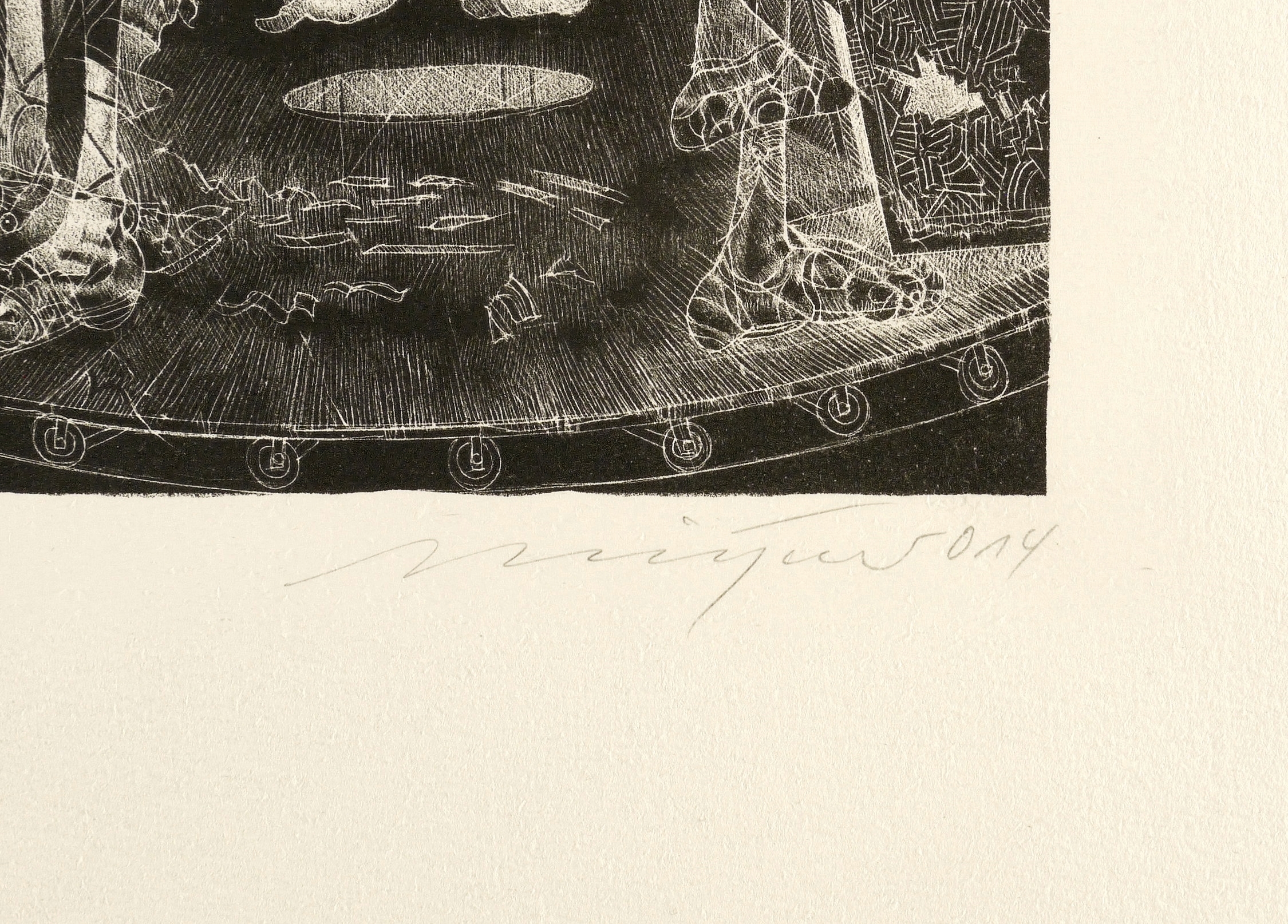 Rolf Münzner (1942 Geringswolde, lebt und arbeitet in Geithain bei Leipzig). Deutscher Zeichner und Grafiker. 1956-60 Lehre und Arbeit als Maschinenschlosser in Leisnig. 1960-62 besucht er Abendkurse an der Hochschule für Grafik und Buchkunst in Leipzig (HGB). 1962-67 Studium der Grafik und Illustration an der HGB u.a. bei Werner Tübke. 1969-72 Aspirantur. 1973-92 Lehrauftrag für Aktzeichnen und Illustration an der HGB. Seit 1990 Leiter der Werkstatt für Lithografie. Seit 1992 Professor. Seine skurrilen Figuren und bewegungsreichen Phantasiewelten werden in der seltenen Technik der Asphaltschabmanier im Steindruck umgesetzt. Detailreichtum und gesteigerte Virtuosität charakterisieren sein Werk ebenso wie eine Vorliebe für literarische Themen, denen er jeweils kongeniale Schöpfungen an die Seite stellt.