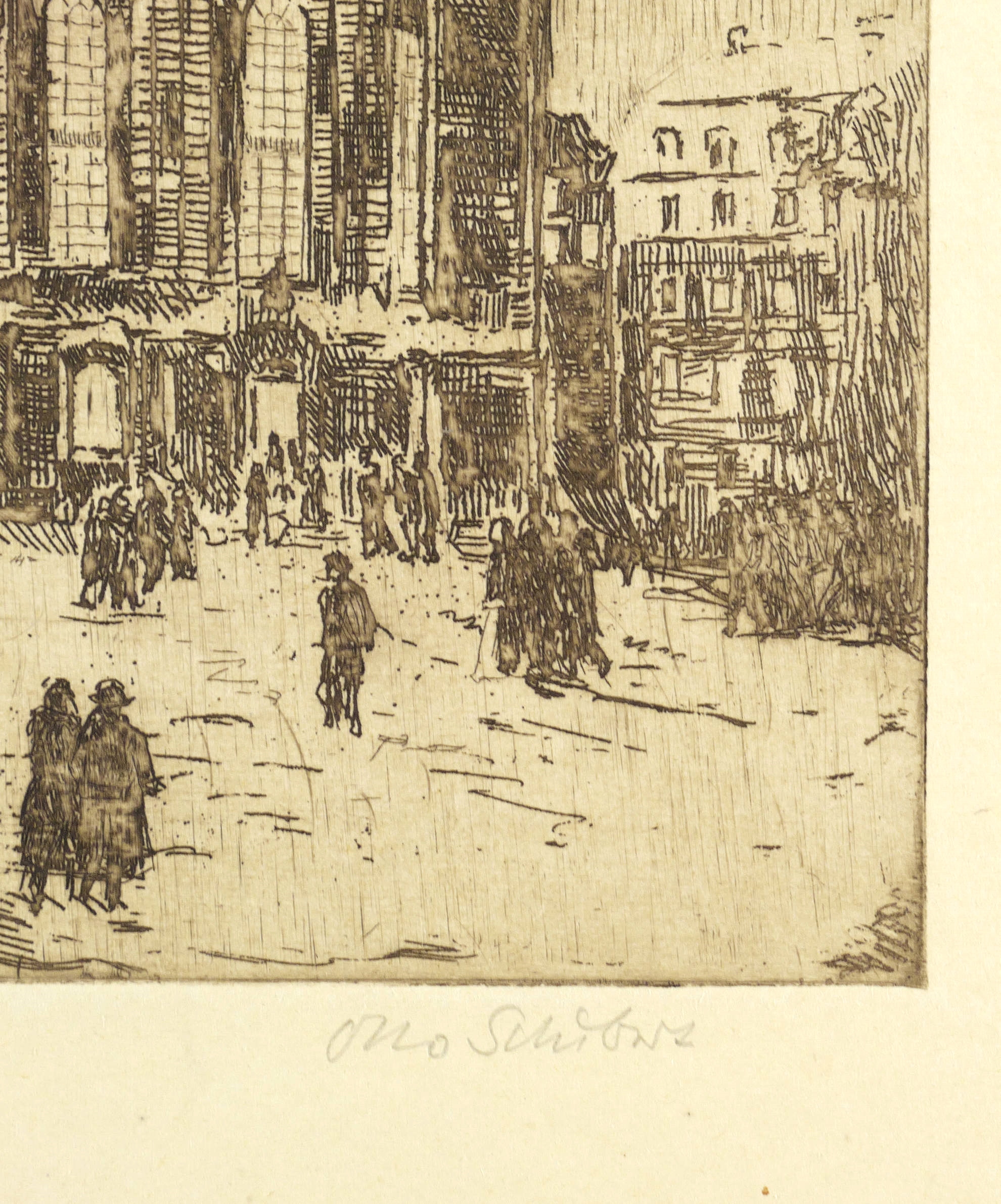 1920-1930. Radierung / Strichätzung, mit Plattenton, in Braun, auf gelbem Velinkarton. – Originale Künstlergrafik, von Otto Schubert. – 23,8 x 15,3 cm (Darstellung / Platte), 32 x 25 cm (Blatt).