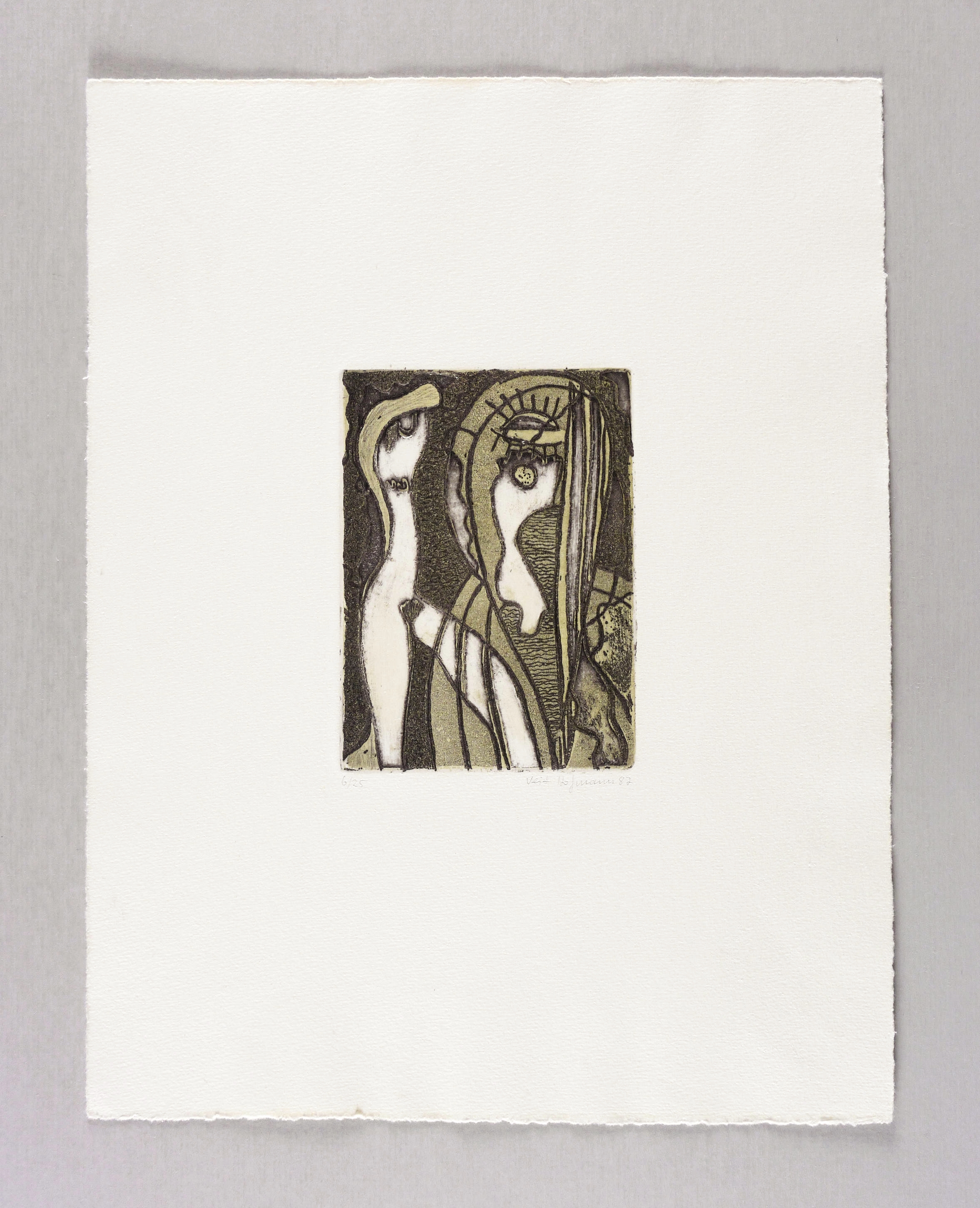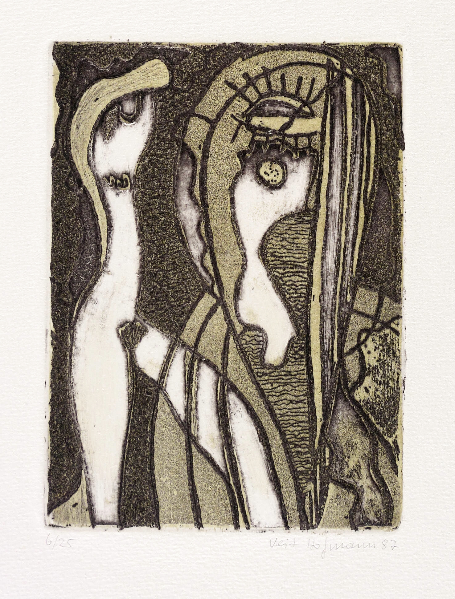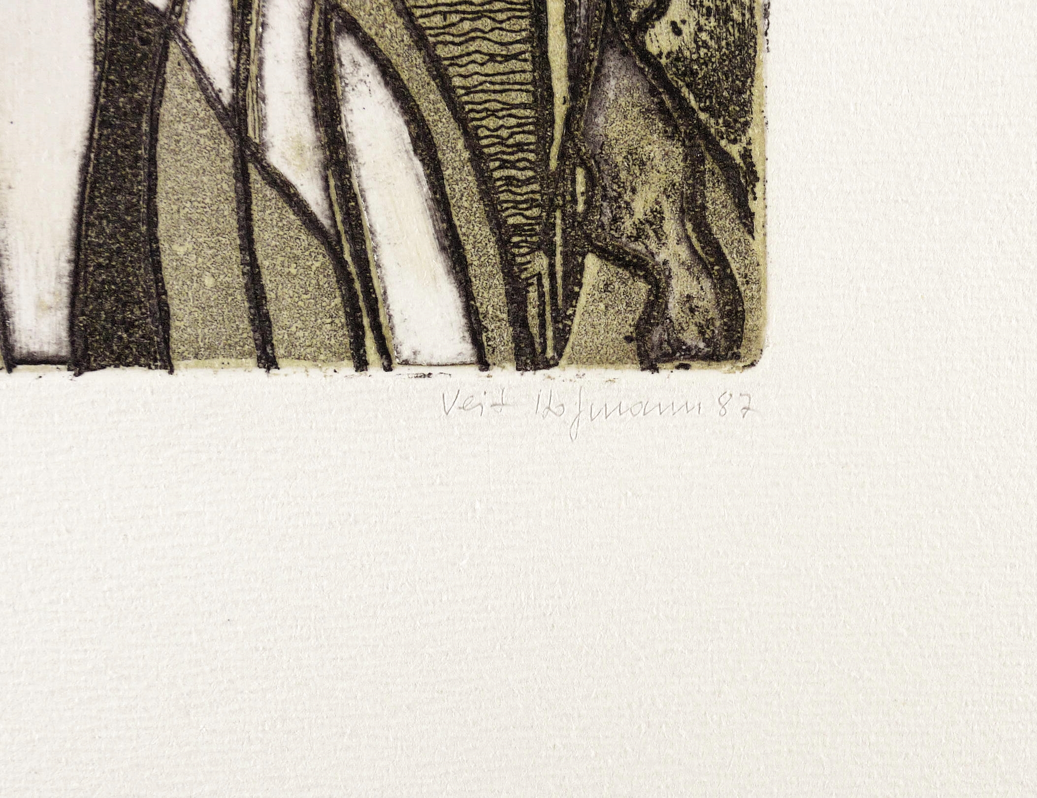 1987. Farbradierung / Aquatinta, in Hellgrau, Braun & Olivgrün, auf hellchamois Velin. – Originale Künstlergrafik, von Veit Hofmann. – Auflage Exemplar Nr. 6/25. – 13,4 x 9,8 cm (Darstellung / Platte), 35 x 27 cm (Blatt).