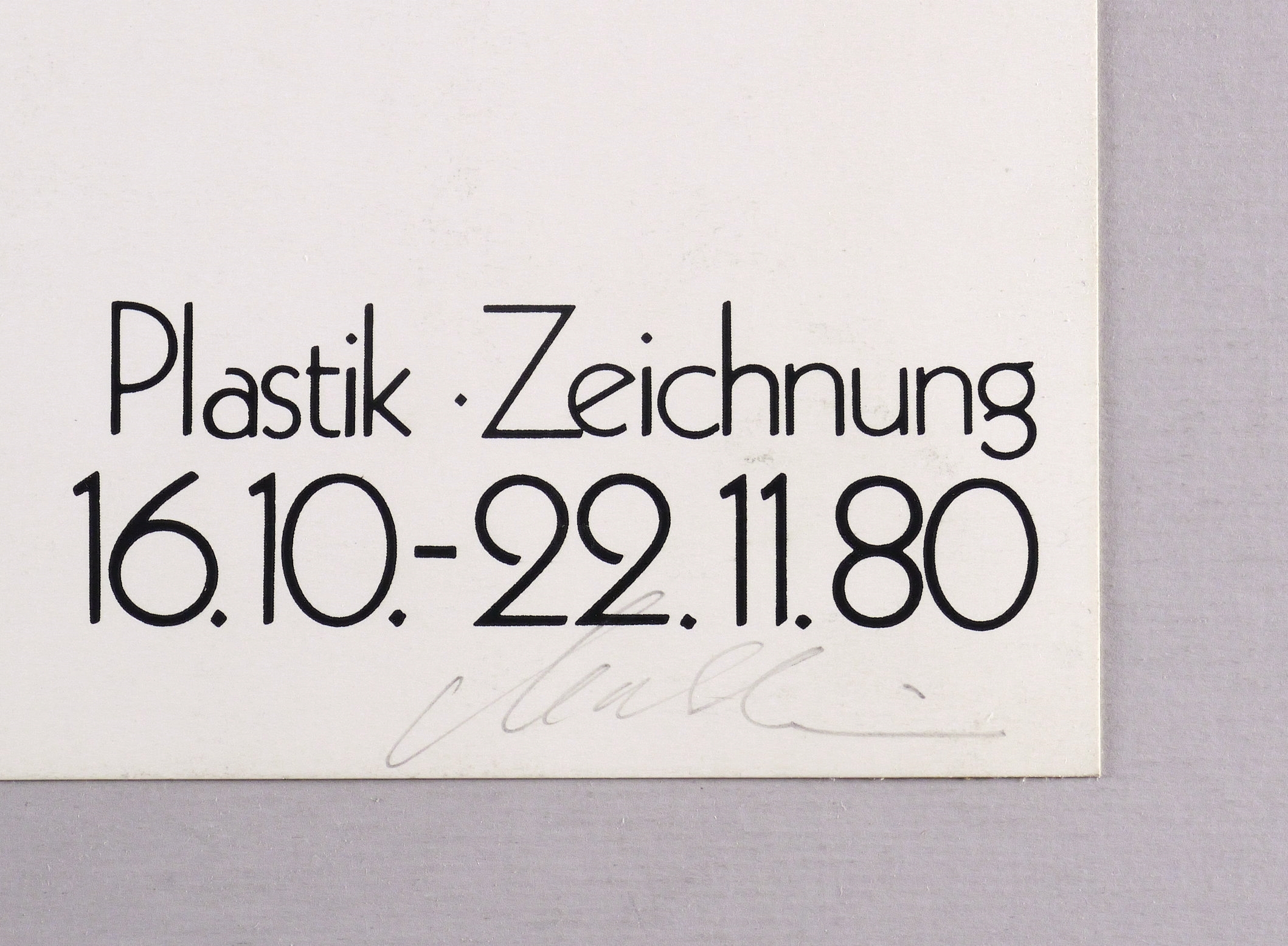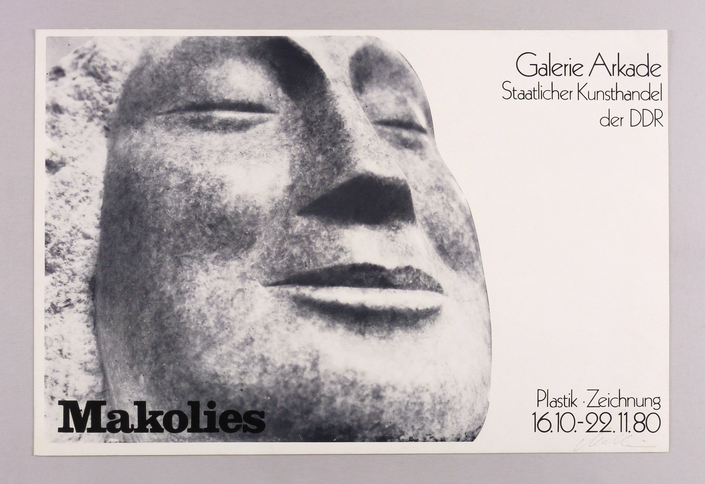 Rechts unten in Bleistift signiert: ″Makolies″. – Originalgrafisches Künstlerplakat zur Ausstellung ″Makolies. Plastik, Zeichnung″ 16.10.-22.11.1980 in der Galerie Arkade in Berlin. – Provenienz: Sammlung Gerlint Söder & Erhard Frommhold, Dresden. – Vorderseite makellos. Rückseite mit Kleberückständen einer älteren Montierung. Mäßig guter Zustand.