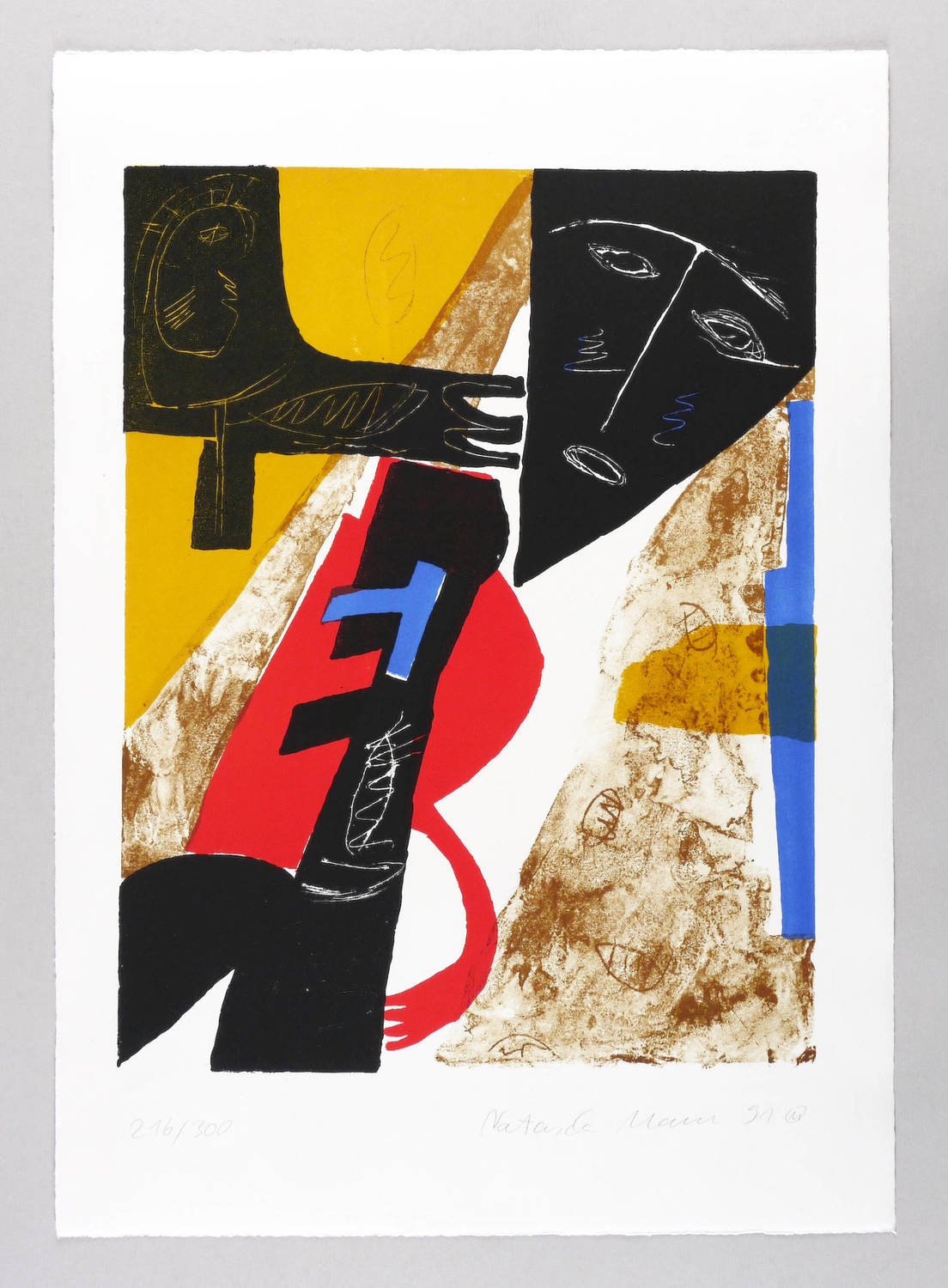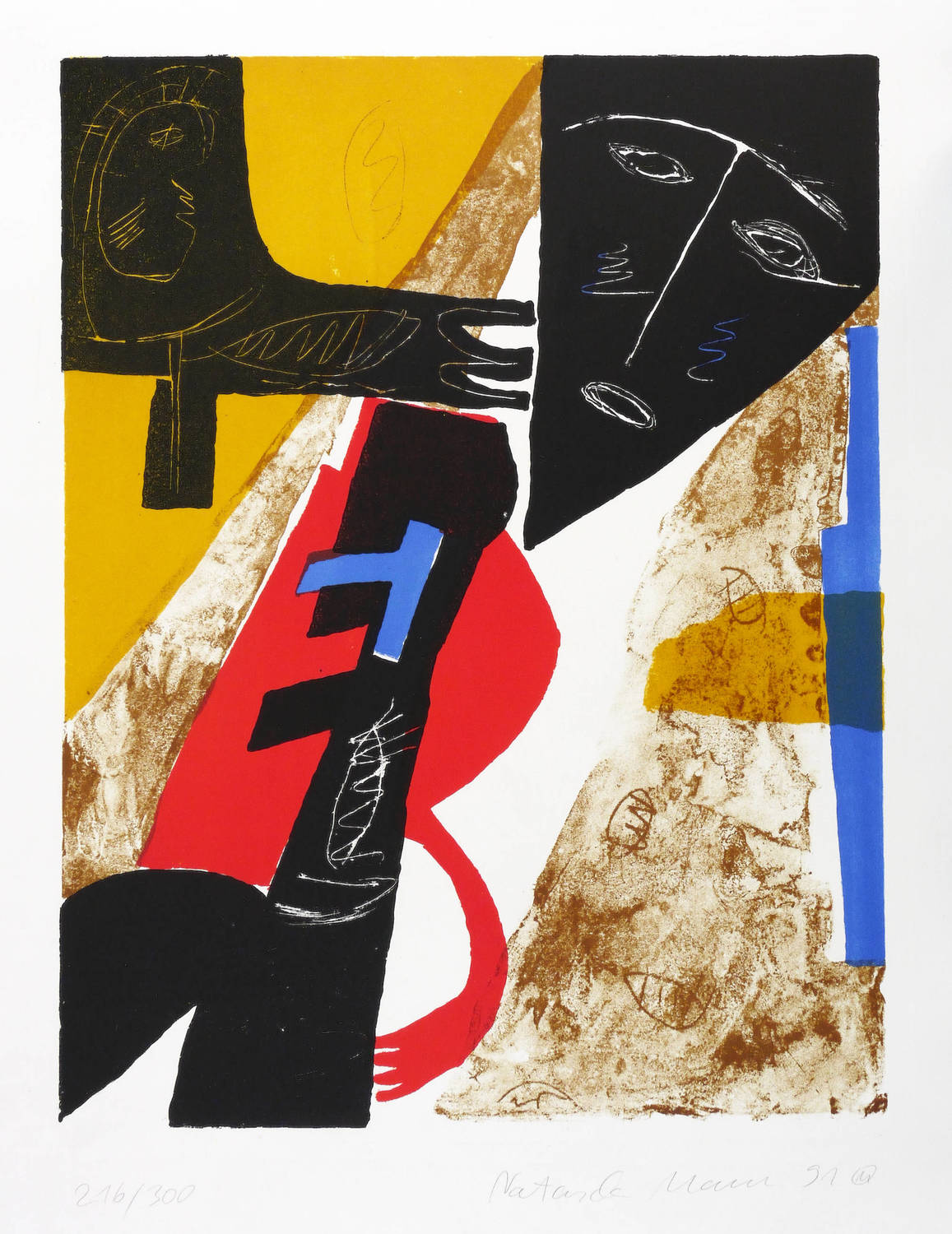 1991. Farblithografie / Pinsellithografie, in 5 Farben, auf festem weißem Velin. – Originale Künstlergrafik, von Natascha Mann. – Auflage Exemplar Nr. 216/300. – 45,3 x 34,8 cm (Darstellung / Druckbild), 60 x 42 cm (Blatt).