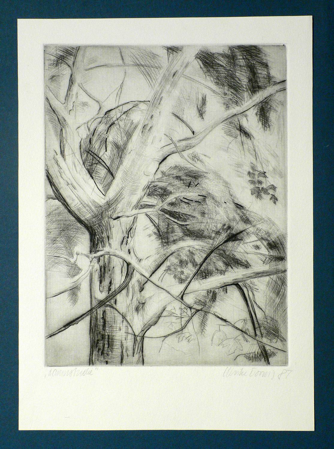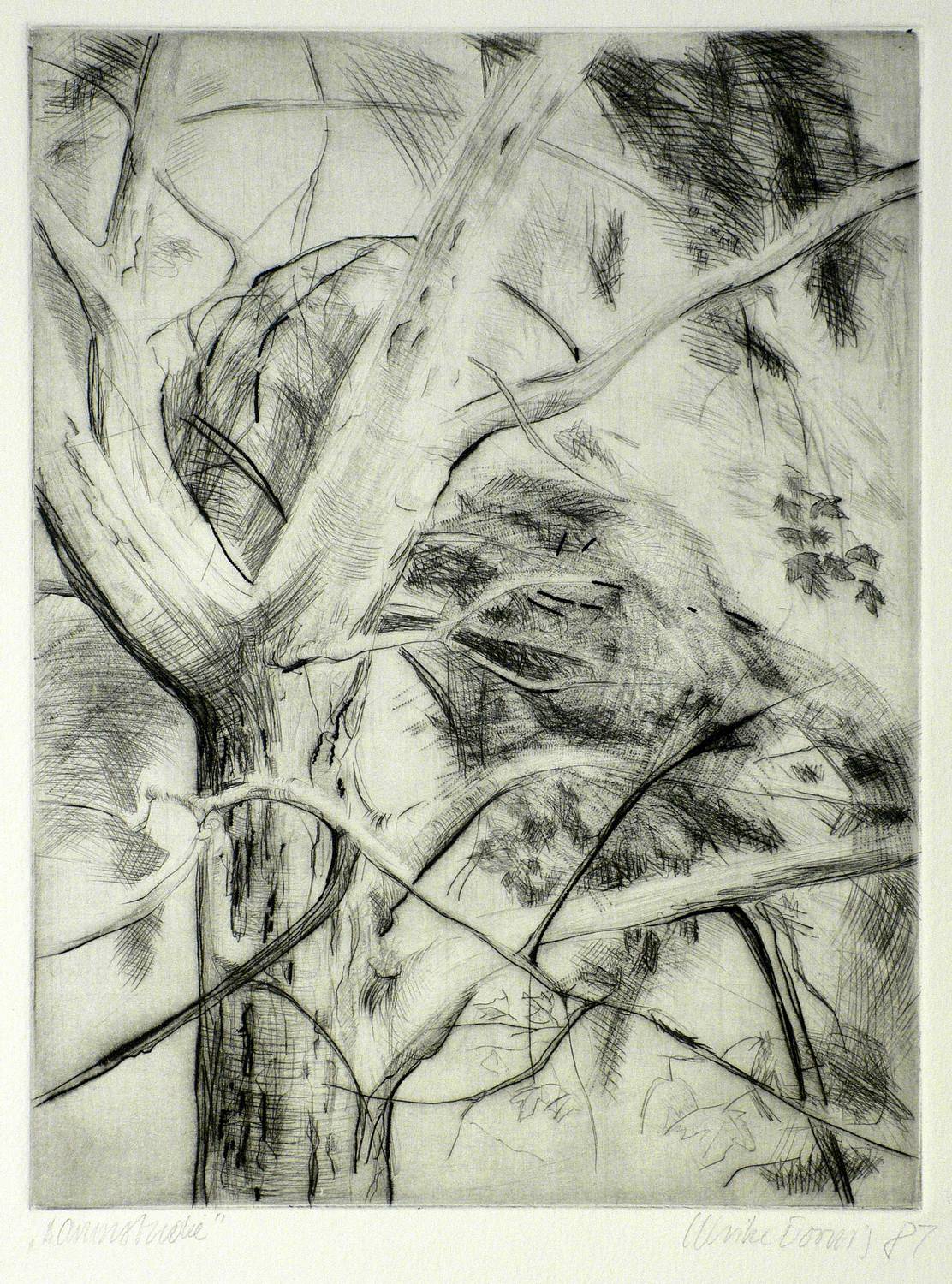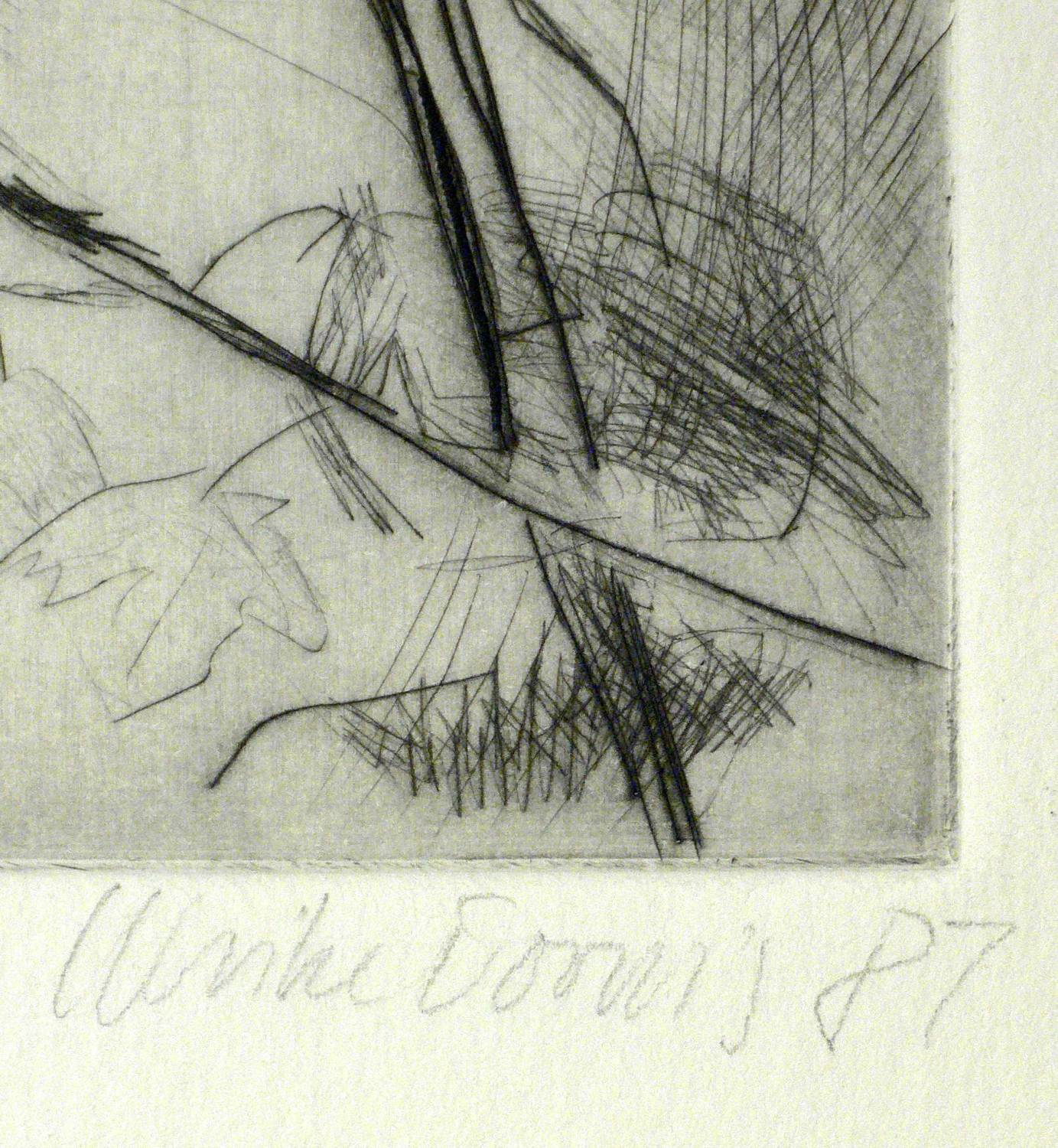 1987. Radierung / Strichätzung & Roulette, in Schwarz, mit Plattenton, auf hellchamois Velin. – Originale Künstlergrafik, von Ulrike Dornis. – 25,0 x 19,0 cm (Darstellung), 32 x 23 cm (Blatt).