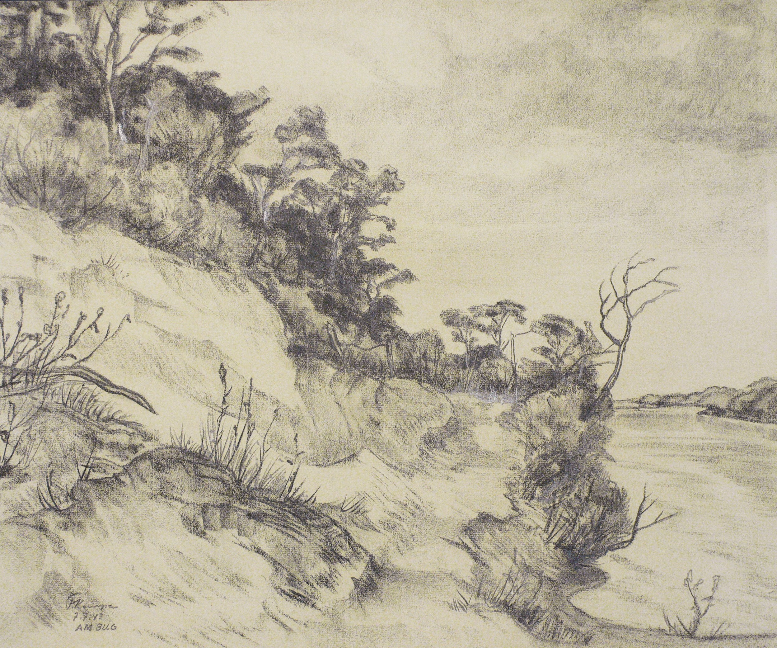 In Bleistift in der Darstellung links unten signiert, datiert und betitelt: ″F. Kempe / 7.7.43 / AM BUG″. – Steiles Flussufer des Bug in der Gegend von Terespol und Brest, im heute polnisch- belarussischen Grenzgebiet. – Tadelloses, frisch anmutendes Blatt.