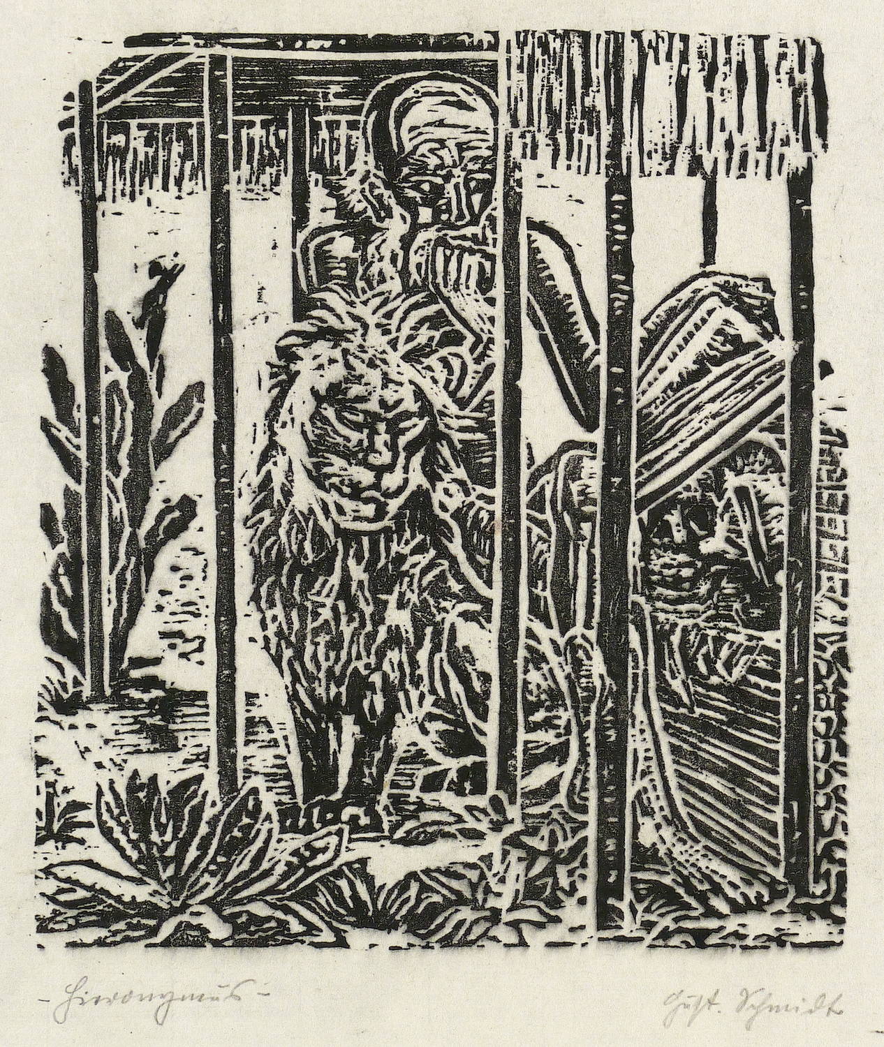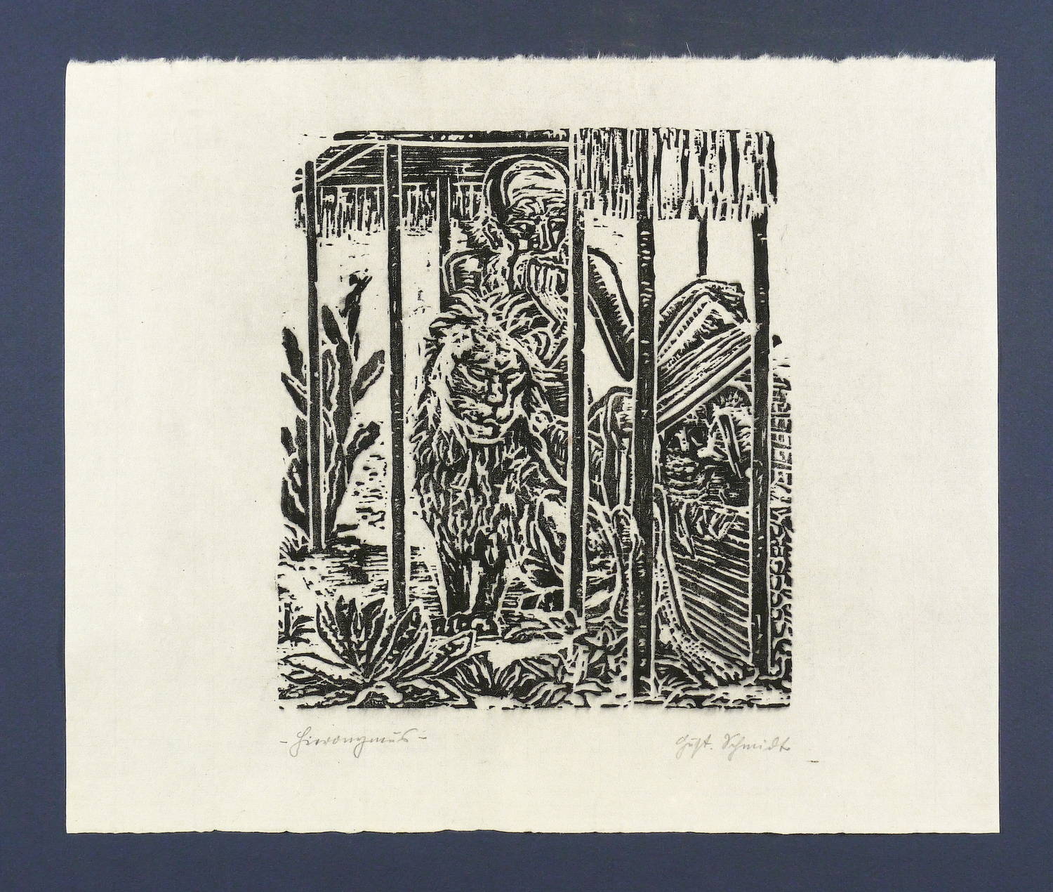 Gustav Schmidt (1888 Peine - 1972 Dresden). Deutscher Maler, Grafiker, Bildhauer und Keramiker. Namhafter Vertreter des expressiven und kritischen Realismus. Studium an der Akademie in Dresden bei Robert Sterl und Carl Bantzer. 1911-13 Meisterschüler bei Otto Gußmann. Als Soldat im Ersten Weltkrieg schwer verwundet kehrte er 1917 als Zeichenlehrer ans Realgymnasium Peine zurück. Seit 1919 als freischaffender Künstler in Dresden. Widmete sich vor allem antiken und biblischen Bildthemen. Sein Werk umfasst Gemälde, Zeichungen sowie druckgrafische Blätter in Holzschnitt und Gipshochdruck, so z.B. die Grafikfolgen "Passion Christi" und "Die ersten Menschen".