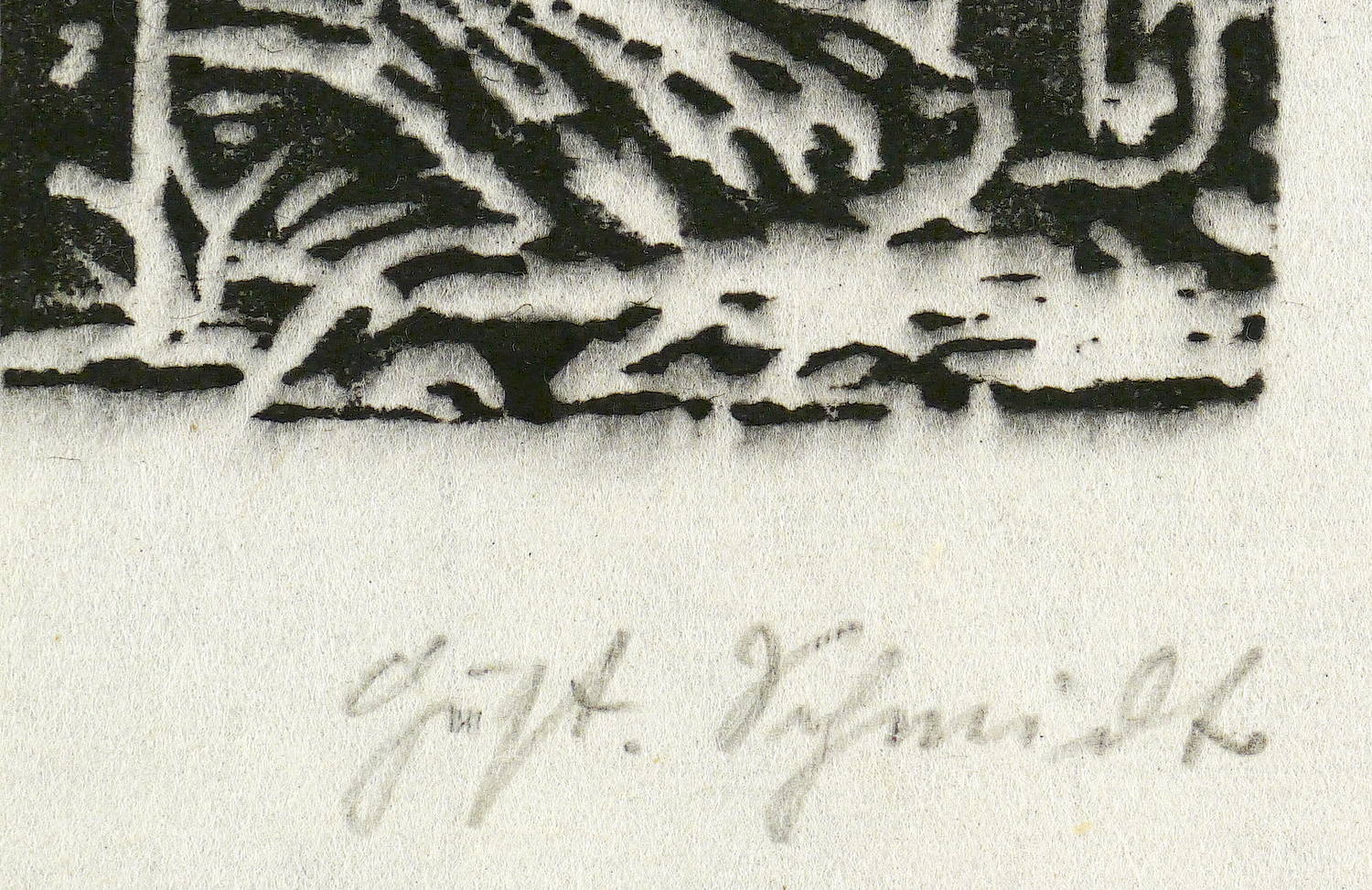 1920. Holzschnitt, in Schwarz, auf Japanbütten. – Originale Künstlergrafik, von Gustav Schmidt. – 24,5 x 21,5 cm (Darstellung / Druckstock), 33 x 40 cm (Blatt).