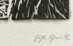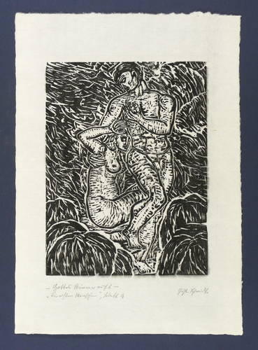 Rechts unten in Bleistift signiert. Links betitelt sowie bezeichnet: ″Die ersten Menschen, Blatt 9″. – Druckfarbe original im Druckprozess geringfügig verlaufen. Guter Zustand.