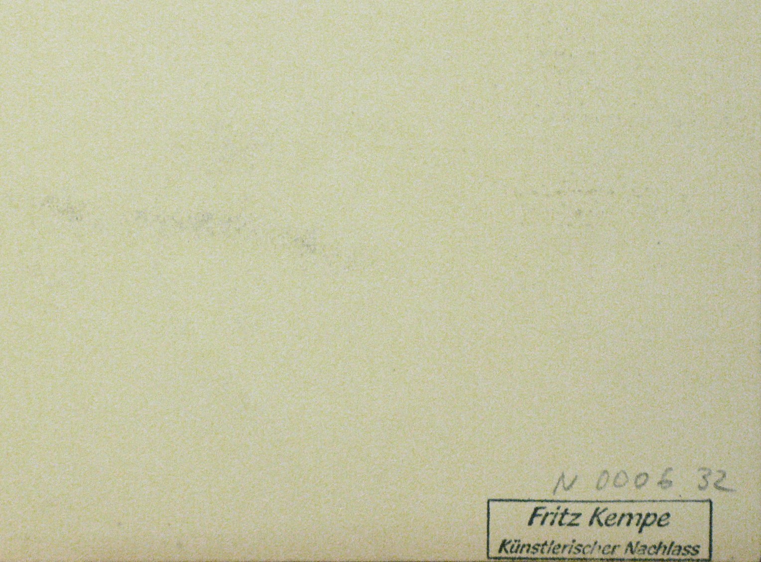 Fritz Kempe (1898 Leipzig - 1971 Dresden). Eigentlich Richard Johann Fritz Kempe. Deutscher Maler und Grafiker in Leipzig und Dresden. Lehre zum Schriftsetzer in Leipzig. Abendkurse an der Akademie für graphische Künste und Buchgewerbe Leipzig. 1917-19 als Soldat im 1. Weltkrieg. 1919-22 Studium an der Kunstakademie Leipzig, unter anderem in der Radierklasse von Alois Kolb. Daneben Kunstgeschichte und Pädagogik an der dortigen Universität. 1922-39 Kunsterzieher im höheren Schuldienst in Leipzig. 1932-40 künstlerischer Leiter der Buchbinderei von Ferdinand Fickentscher. Gehörte dem Freundeskreis um Felix Skoda und Rudolf Lipus an. 1942 Ernennung zum Professor. 1943-45 Kriegsdienst im 2. Weltkrieg. 1944 unter Verlust eines Großteils seines Werkes in Leipzig ausgebombt. Ab 1952 dauerhaft in Dresden ansässig. Auszeichnungen: 1935/36 Internationale Grafikschau Chicago, 1937 Grand Prix für Grafik der Weltausstellung Paris, 1938 Sächsische Staatsmedaille. Mitglied im Verband Bildender Künstler. 1953 und 1962 Teilnahme an der 3. und 5. Kunstausstellung der DDR in Dresden.
