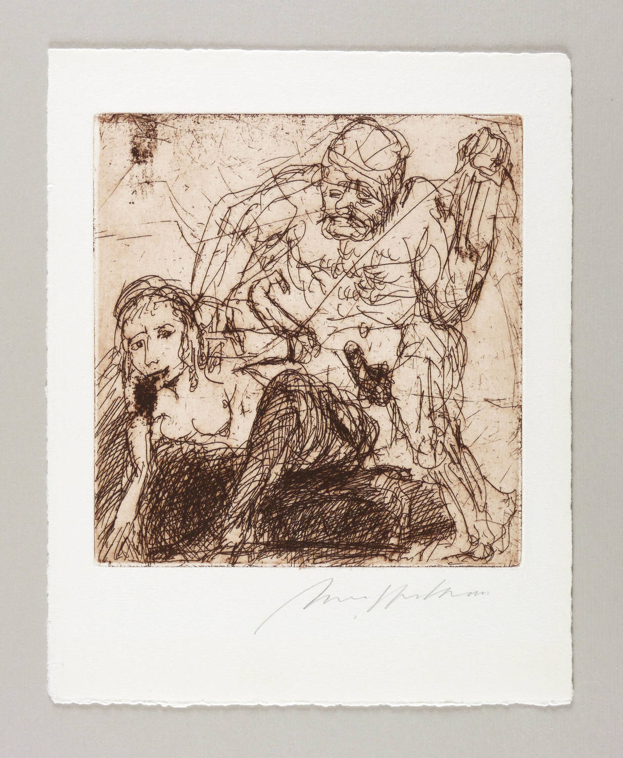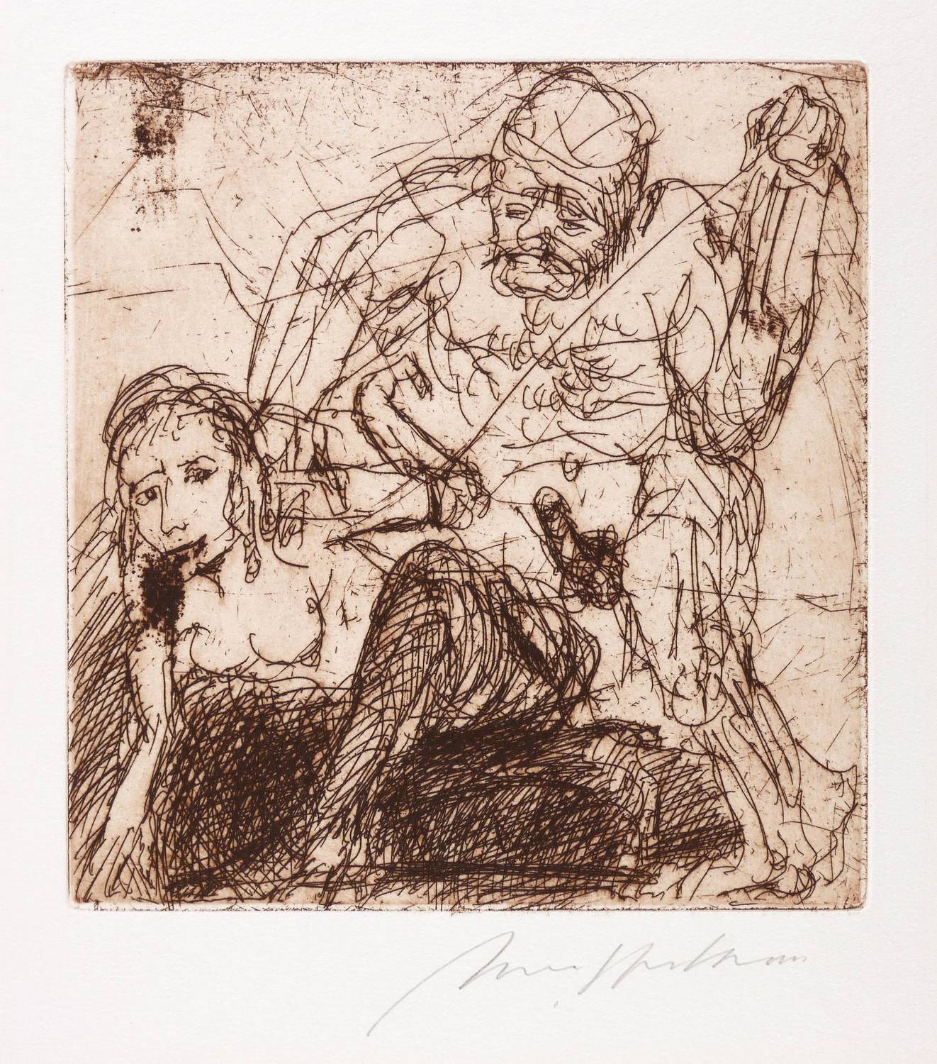 2000. Radierung / Strichätzung, in Schwarzrot, mit Plattenton, auf weißem Büttenpapier. – Originale Künstlergrafik, von Alfred Hrdlicka. – Auflage 120 Exemplare. – 19,7 x 18,7 cm (Darstellung / Platte), 29 x 23 cm (Blatt).