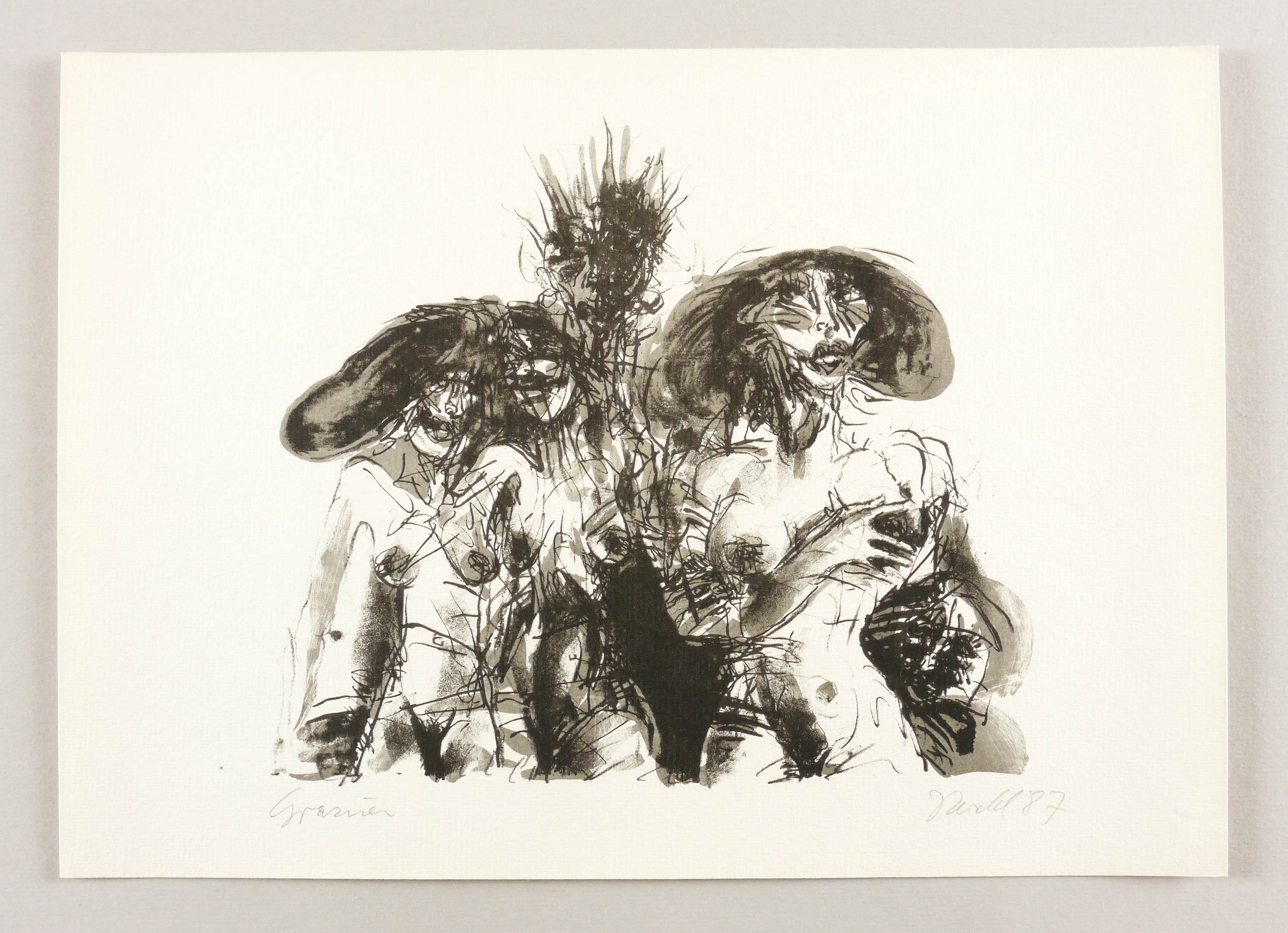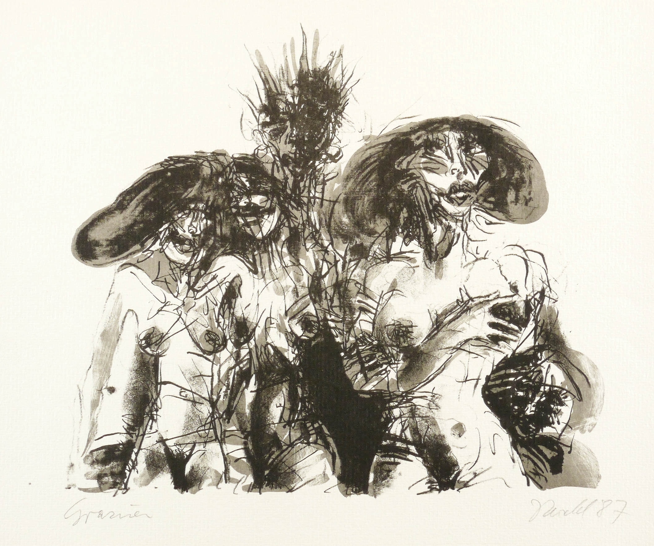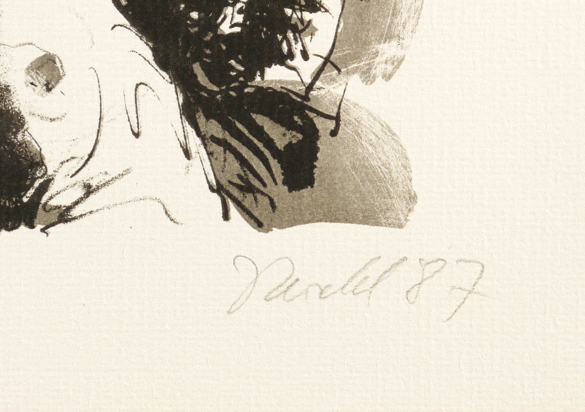 1987. Farblithografie / Pinsellithografie, in Grau & Schwarz, auf hellgelbem hartem Maschinenbütten. – Originale Künstlergrafik, von Rainer Herold. – 24,3 x 27,4 cm (Darstellung / Druckbild), 30 x 42 cm (Blatt).