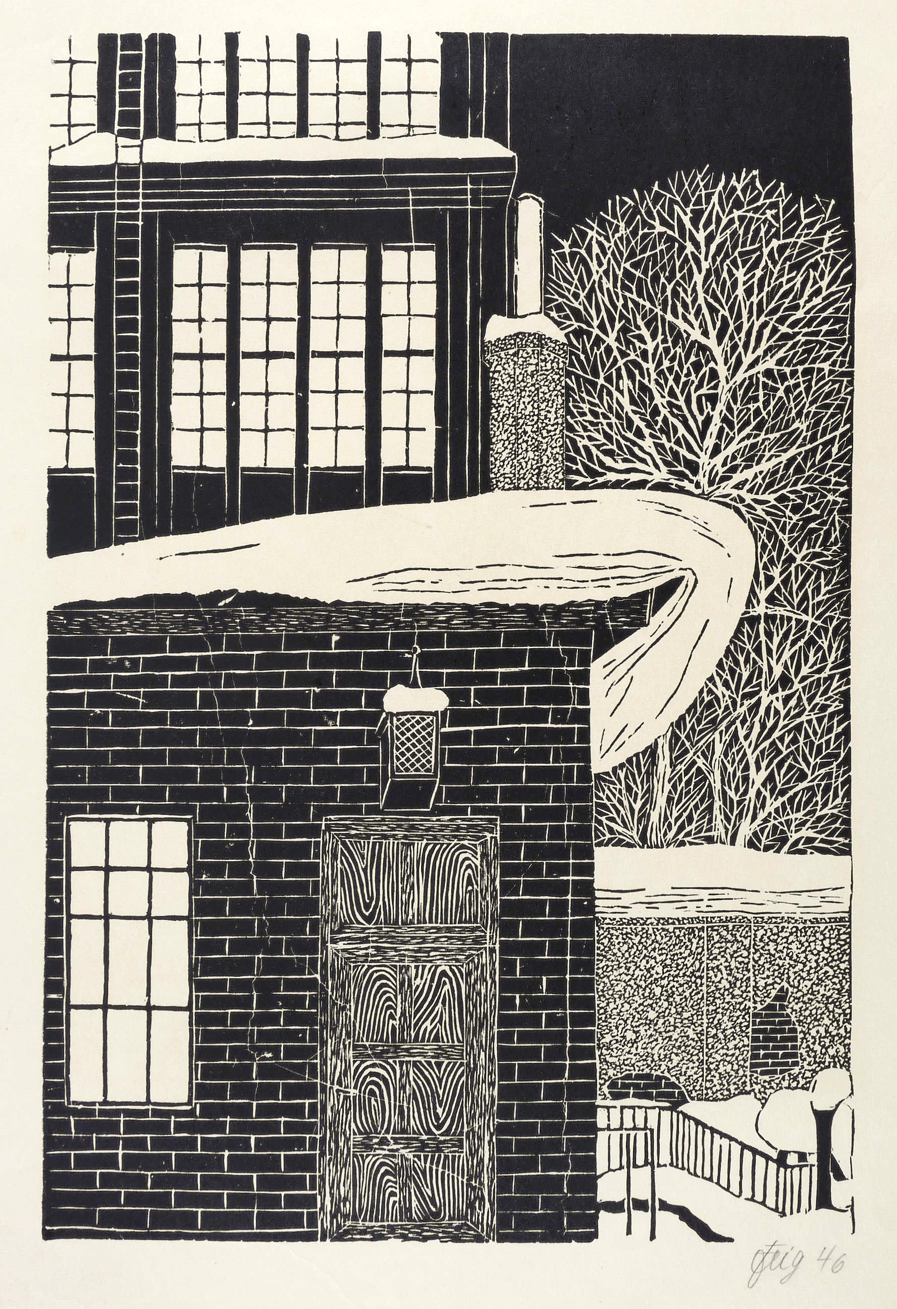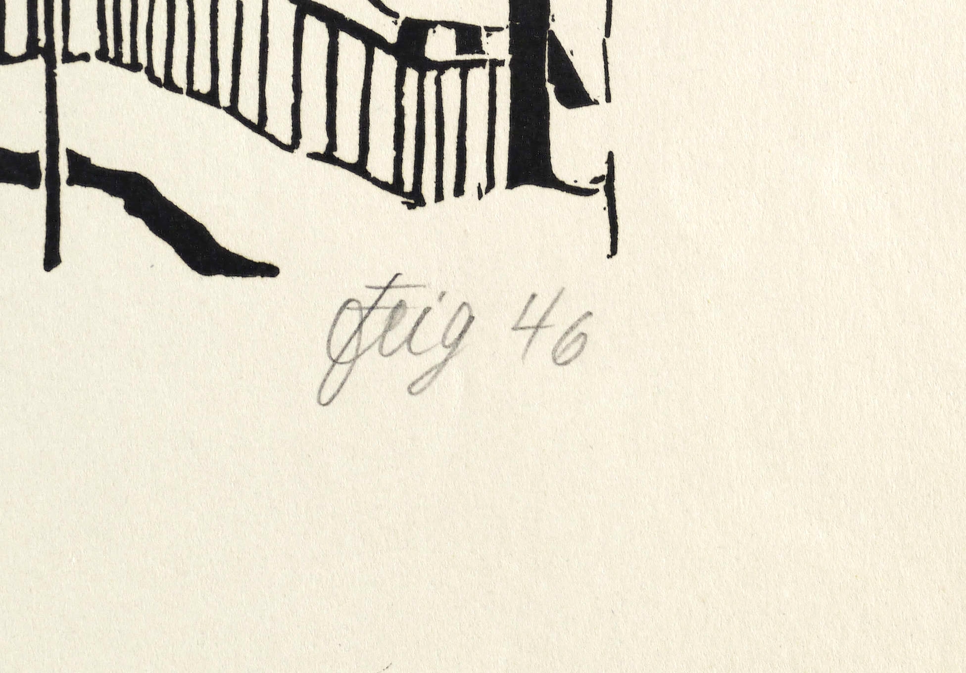 Rechts unten in Bleistift signiert und datiert: ″Fleig 46″. – Aus einer Mappe ″12 Linolschnitte″ der Graphikklasse von Prof. Eduard Ege an der Meisterschule für Deutschlands Buchdrucker in München 1946. – Insgesamt guter Zustand.