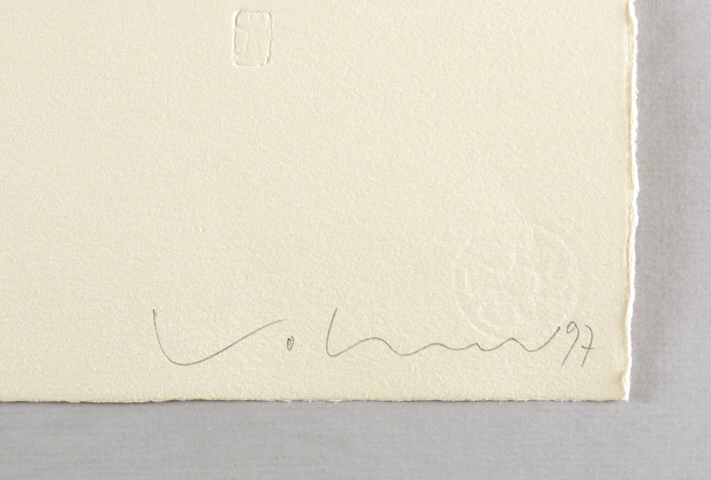 Rechts unten in Bleistift signiert und datiert: ″Volmer 97″. Links Auflagenbezeichnung. Mittig Titel. Im Stein oben spiegelschriftlich Titel, rechts unten Datum. Dazu Trockenstempel mit Künstlersignet. Wasserzeichen der Hahnemühle. – Tadellos. Sehr guter Zustand.