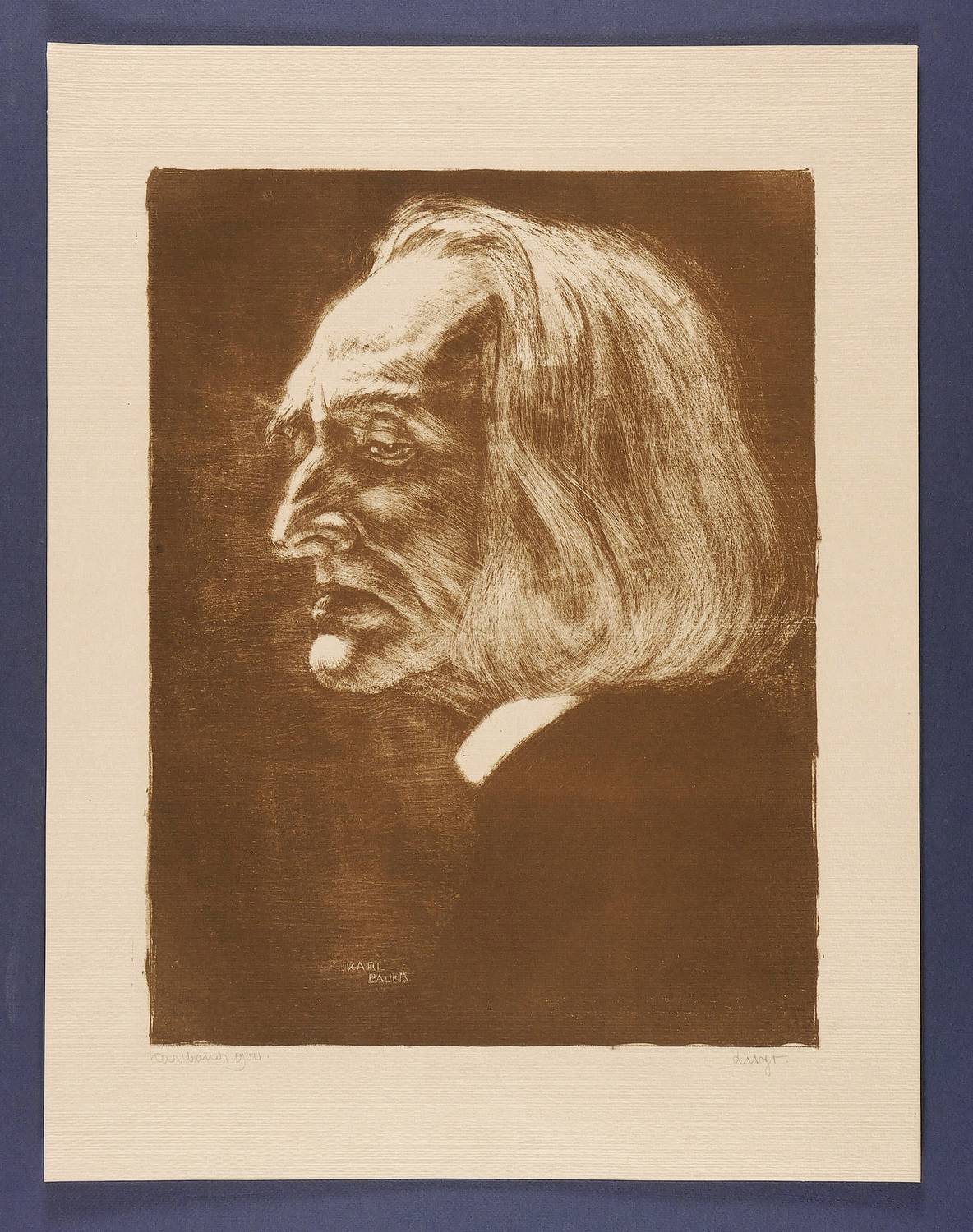 Links unten in Bleistift signiert und datiert: ″Karl Bauer 1904″. Rechts Titel. Im Stein unten Ritzsignatur: ″KARL BAUER″. – Leichte Knickspur im Rand links oben. Sonst sehr gut erhalten.