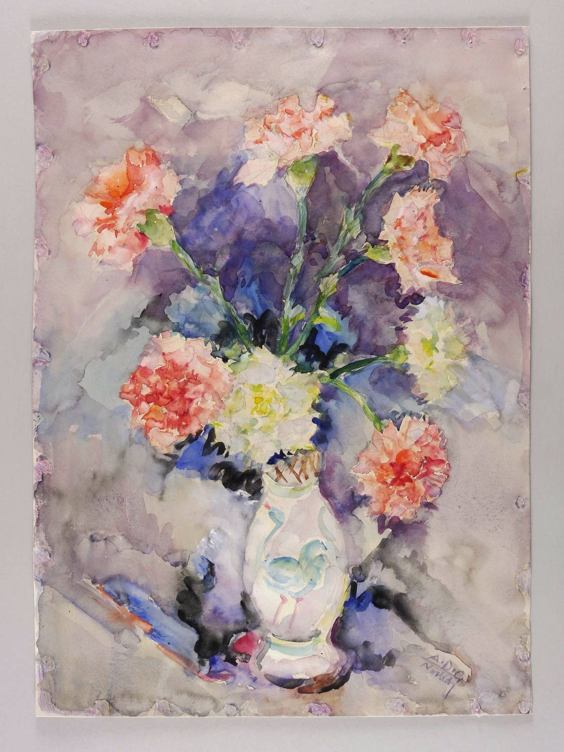 Rechts unten in violettem Farbstift signiert: ″A.D. G. Nerlich″. Verso in Kugelschreiber nochmals signiert und datiert: ″G. Nerlich 1974″. – Im äußeren Blattrand umlaufend Reißzwecklöchlein aus dem Herstellungsprozess. Tadellos. Sehr guter Zustand.