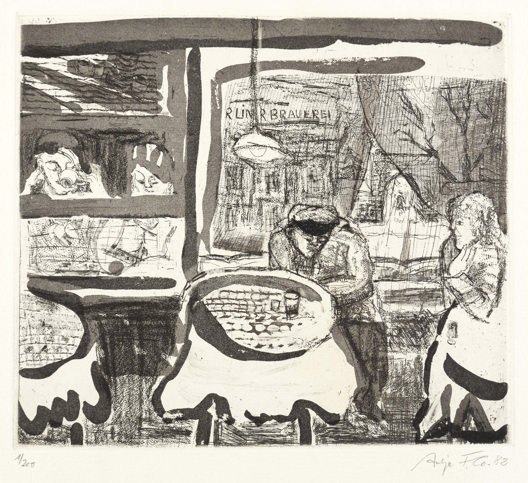 1982. Radierung / Strichätzung, Aquatinta & Roulette, in Schwarz, auf hellchamois Weißenborn-Bütten. – Von Antje Fretwurst-Colberg. – Auflage Exemplar Nr. 1/200. – 21,6 x 24,7 cm (Darstellung / Platte), 31 x 29 cm (Blatt).