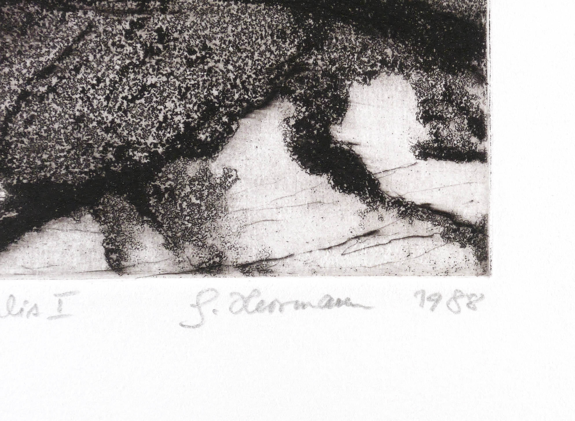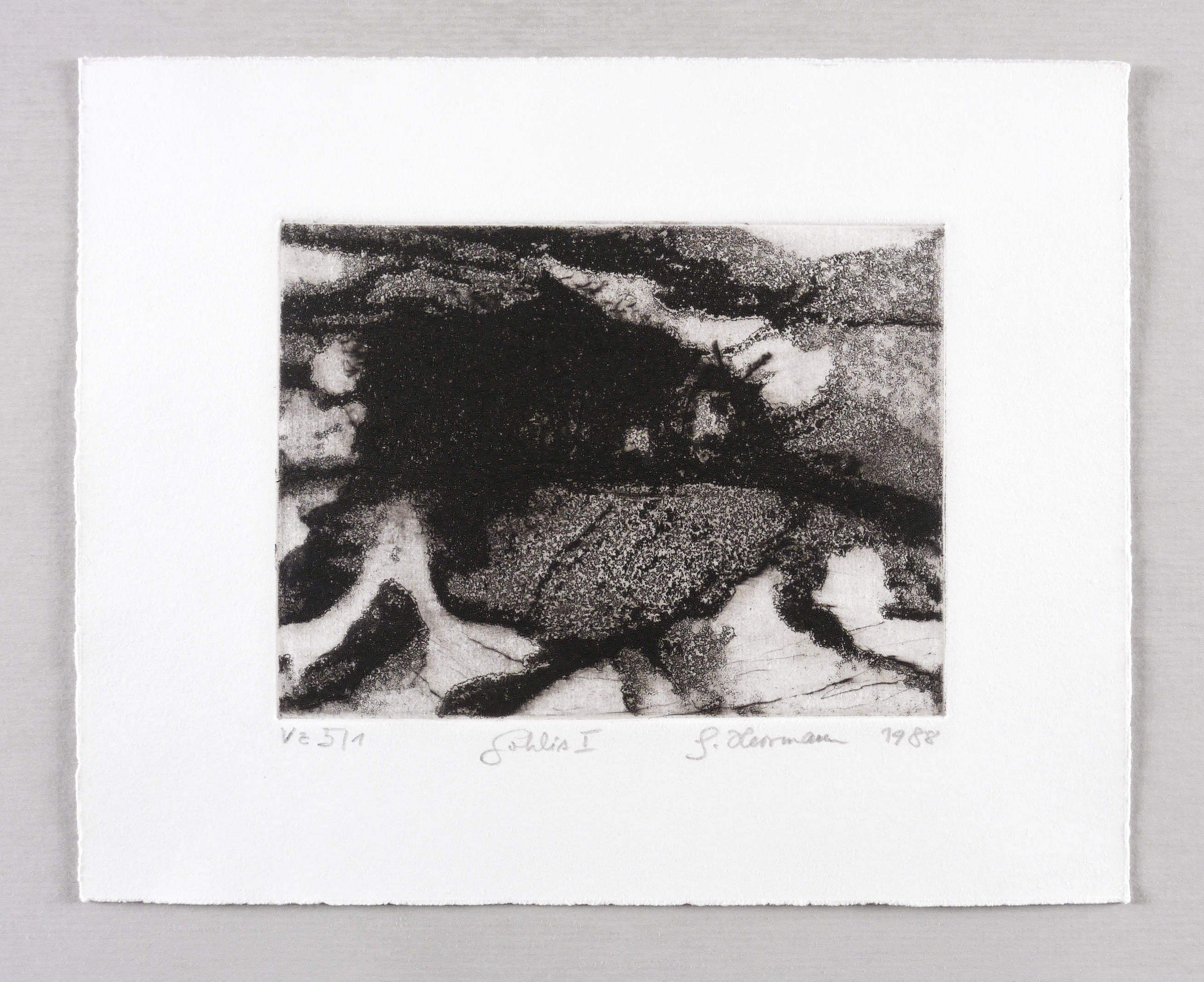1988. Radierung / Aquatinta, in Schwarz, auf schwerem hellchamois Bütten. – Originale Künstlergrafik, von Gunter Herrmann. – Auflage Exemplar Nr. 1/5. – 11,8 x 15,8 cm (Darstellung / Platte), 21 x 25 cm (Blatt).
