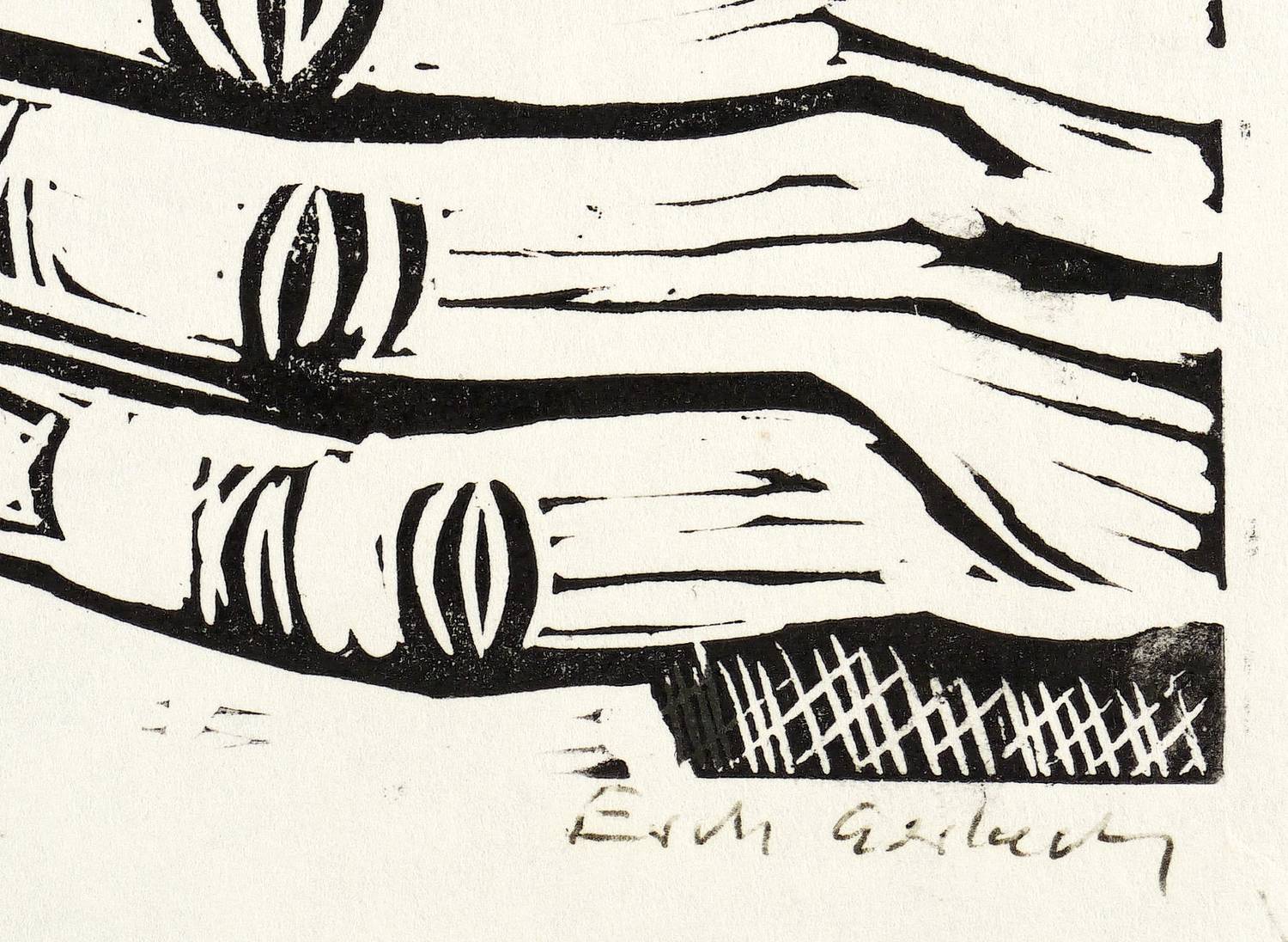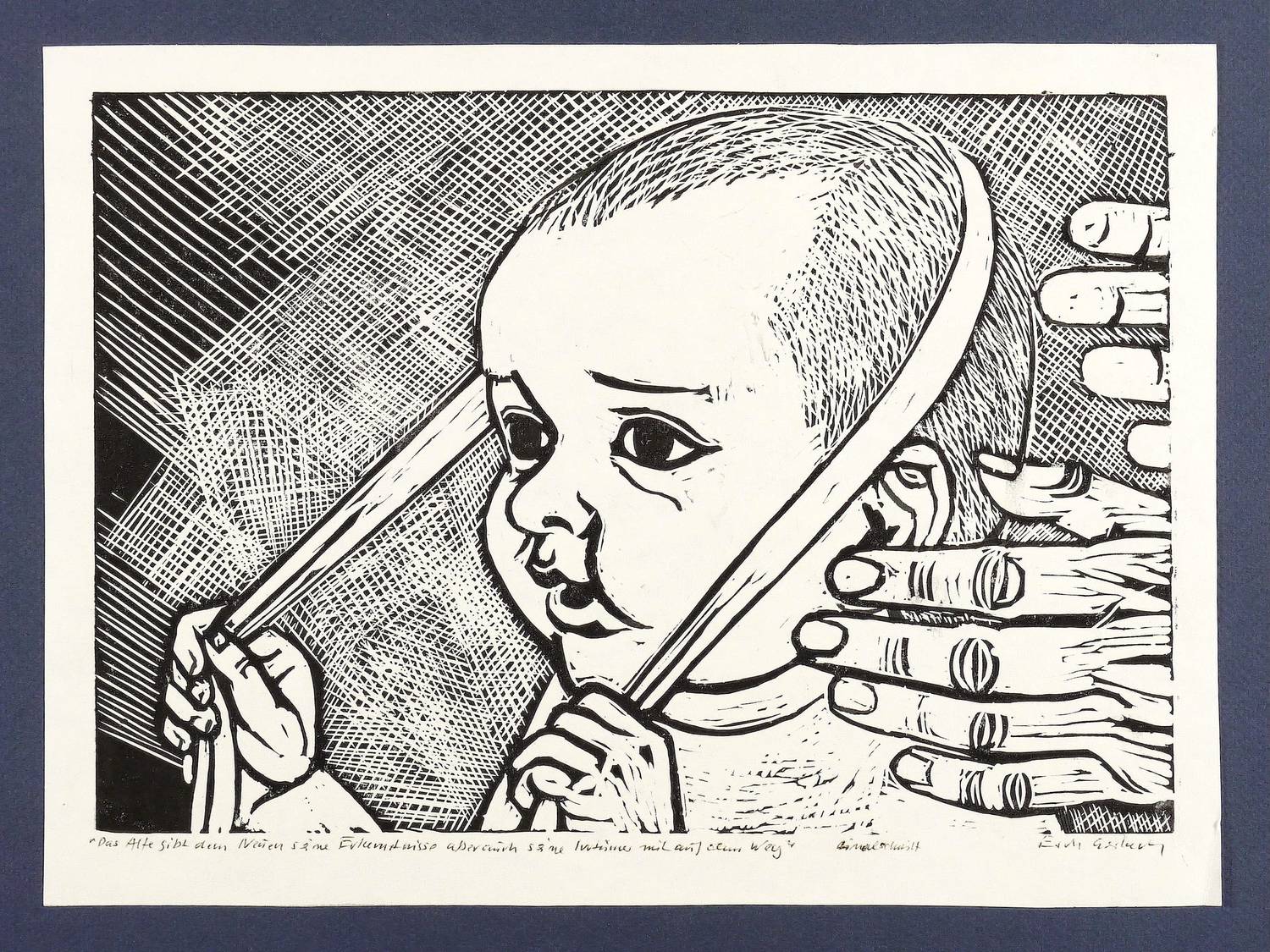 Rechts unten in Kugelschreiber signiert. Links bezeichnet und datiert: ″'Das Alte gibt dem Neuen seine Erkenntnisse aber auch seine Irrtümer mit auf den Weg' / Linolschnitt″. – Unauffälliges Eselsohr in der rechten unteren Ecke. Sonst sehr gut erhalten.