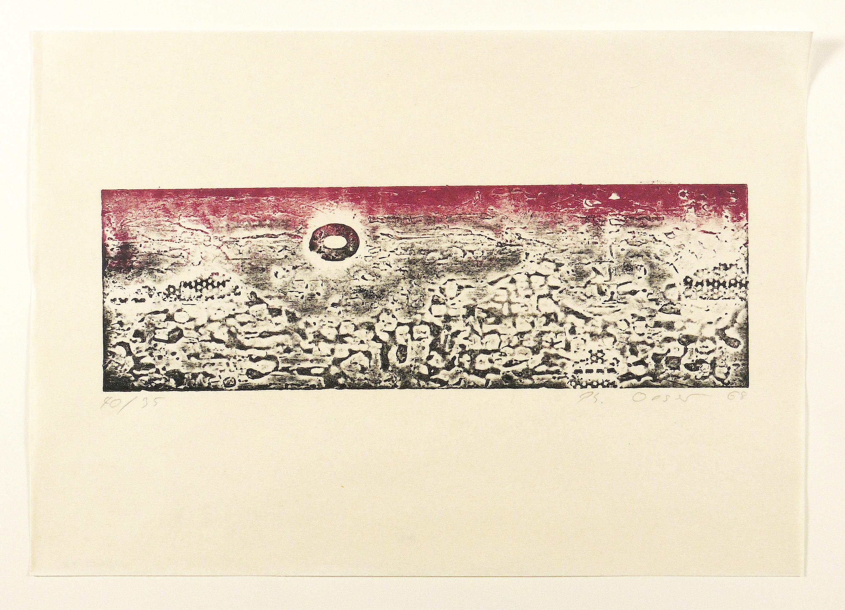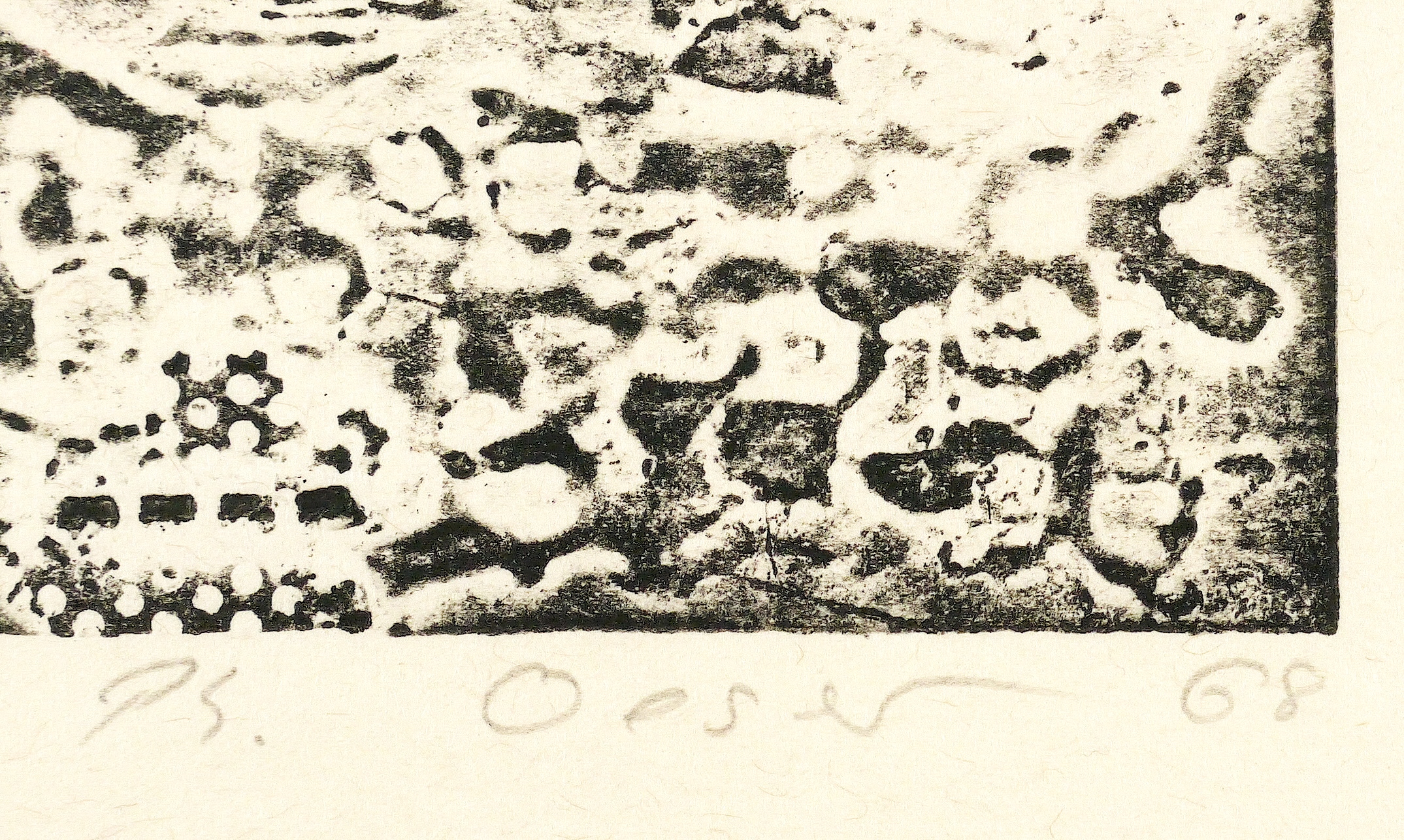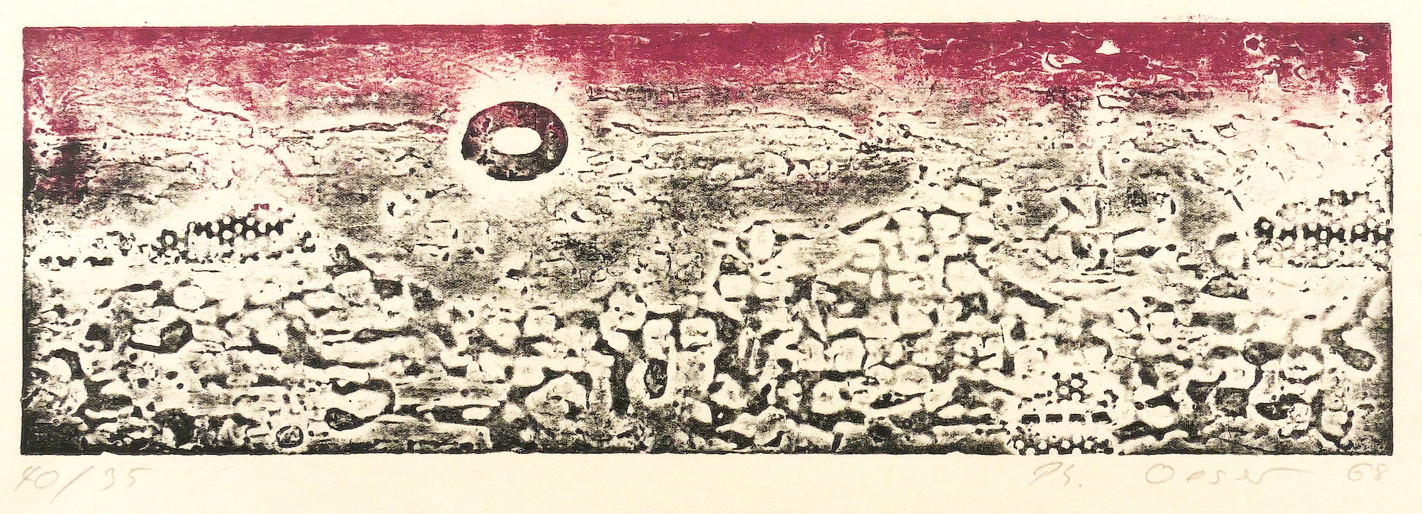 1968. Farbradierung / Materialdruck, in Rot & Schwarz, auf hellchamois Velinkarton. – Originale Künstlergrafik, von Philip Oeser. – Auflage Exemplar Nr. 35/40. – 11,1 x 35,2 cm (Darstellung / Platte), 30 x 42 cm (Blatt).