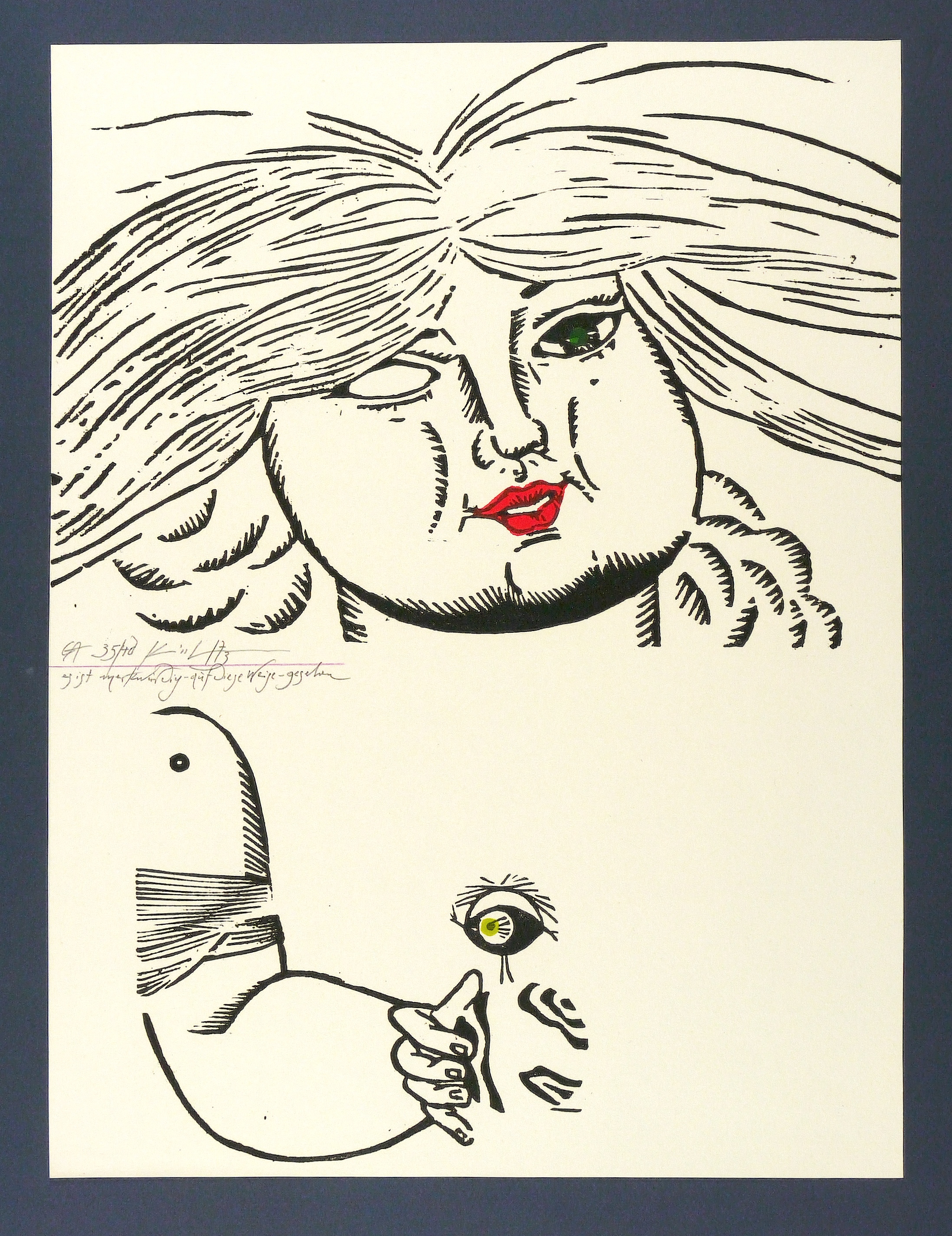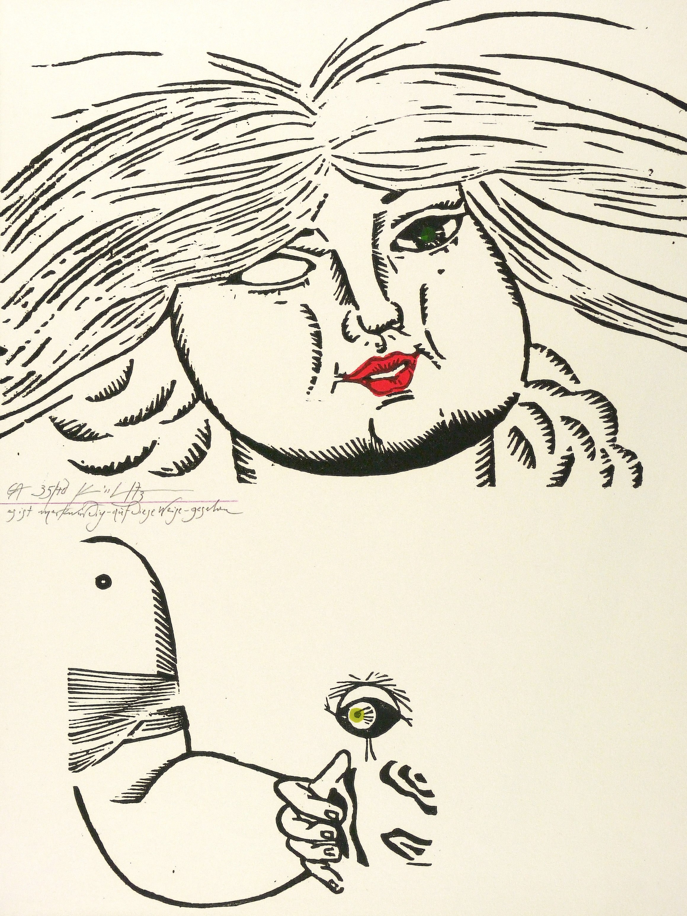 1973. Farblinolschnitt, in 3 Farben, auf hellgelbem Velin. – Originale Künstlergrafik, von Ingo Kirchner. – Auflage Exemplar Nr. 35/46. – 47,6 x 35,8 cm (Darstellung / Blatt).