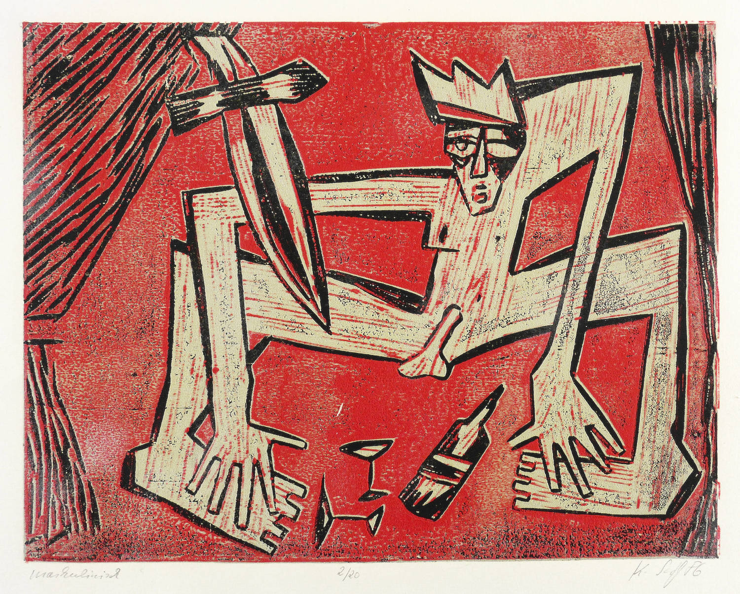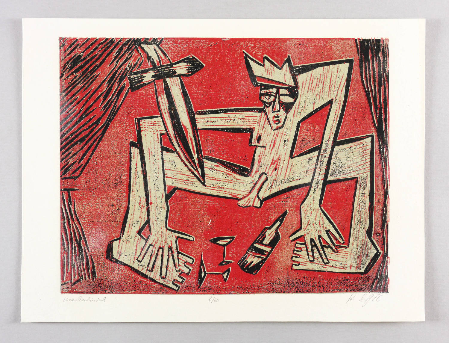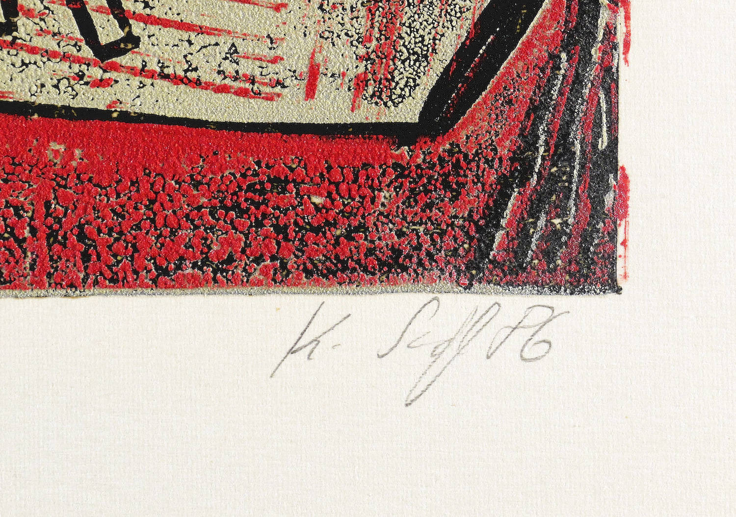 1986. Farbholzschnitt, in Hellgrau, Rot & Schwarz, auf hellchamois Weißenborn. – Originale Künstlergrafik, von Klaus Süß. – Auflage Exemplar Nr. 2/20. – 36 x 48 cm (Blatt), 30,5 x 39,2 cm (Darstellung / Druckbild).