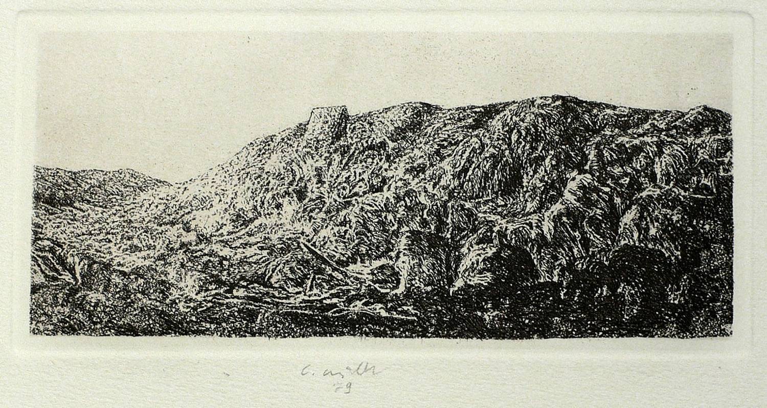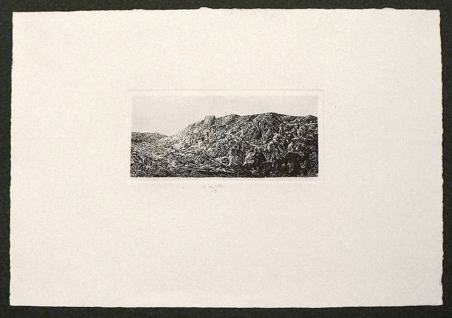 1979. Radierung / Strichätzung, in Schwarz, auf hellchamois Velin. – Originale Künstlergrafik, von Claus Müller-Schloen. – 8,3 x 17,8 cm (Darstellung / Platte), 27 x 40 cm (Blatt).